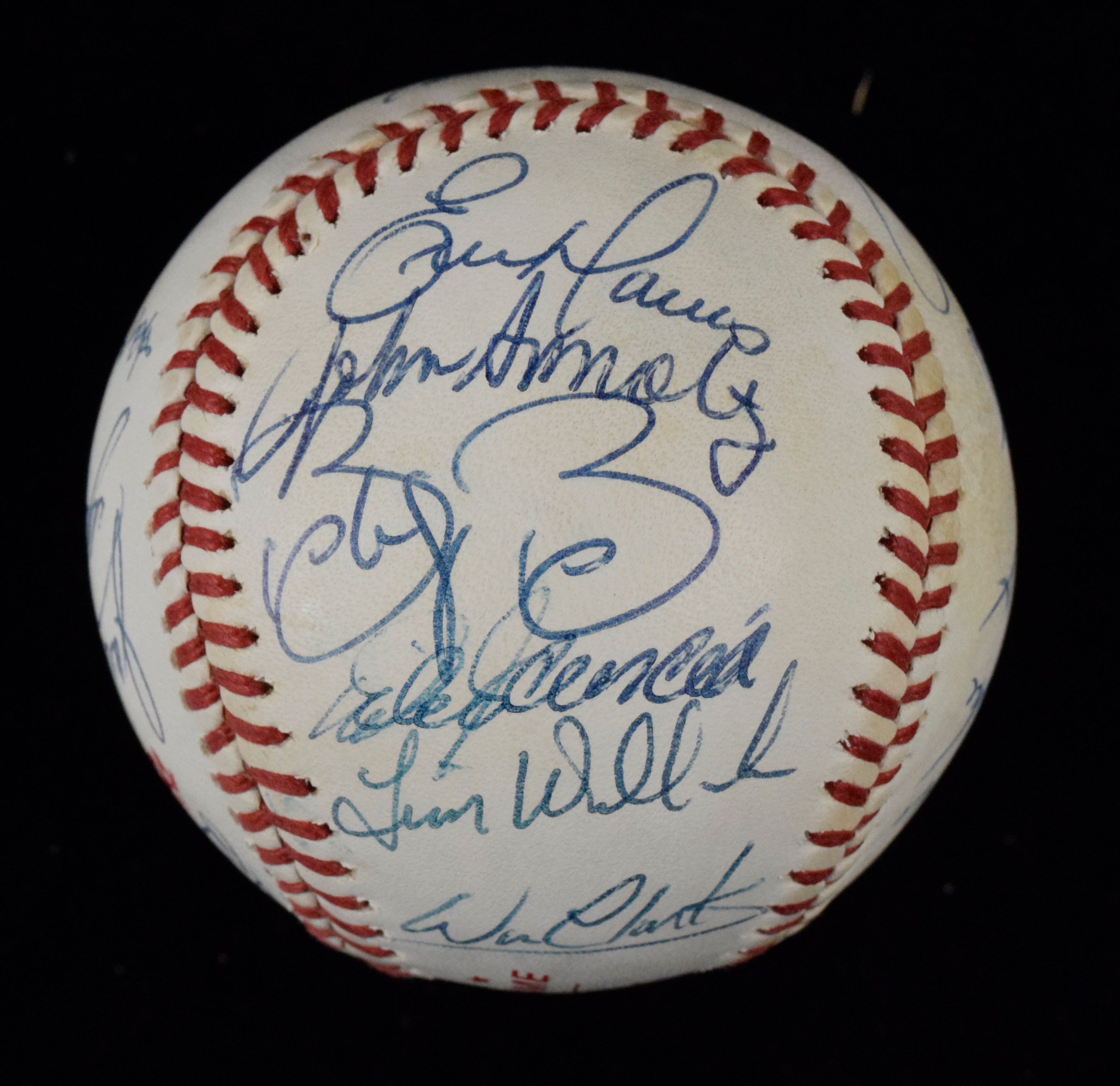 Description:1989 National League All-Stars team signed baseball (EX). Rawlings official 1989 All-Star Game ball signed by (22) members of the NL team including John Smoltz, Barry Larkin, Andre Dawson, Will Clark, Eric Davis, Benito Santiago, Rick Reuschel, Vince Coleman, Mike Scott, Bobby Bonilla, Mike Scioscia, Tim Wallach, John Franco, anmd others (Lasorda is clunhouse signed). Signatures rate 7/8 to 9/10 out of 10. Scattered areas of light to moderate toning: EX