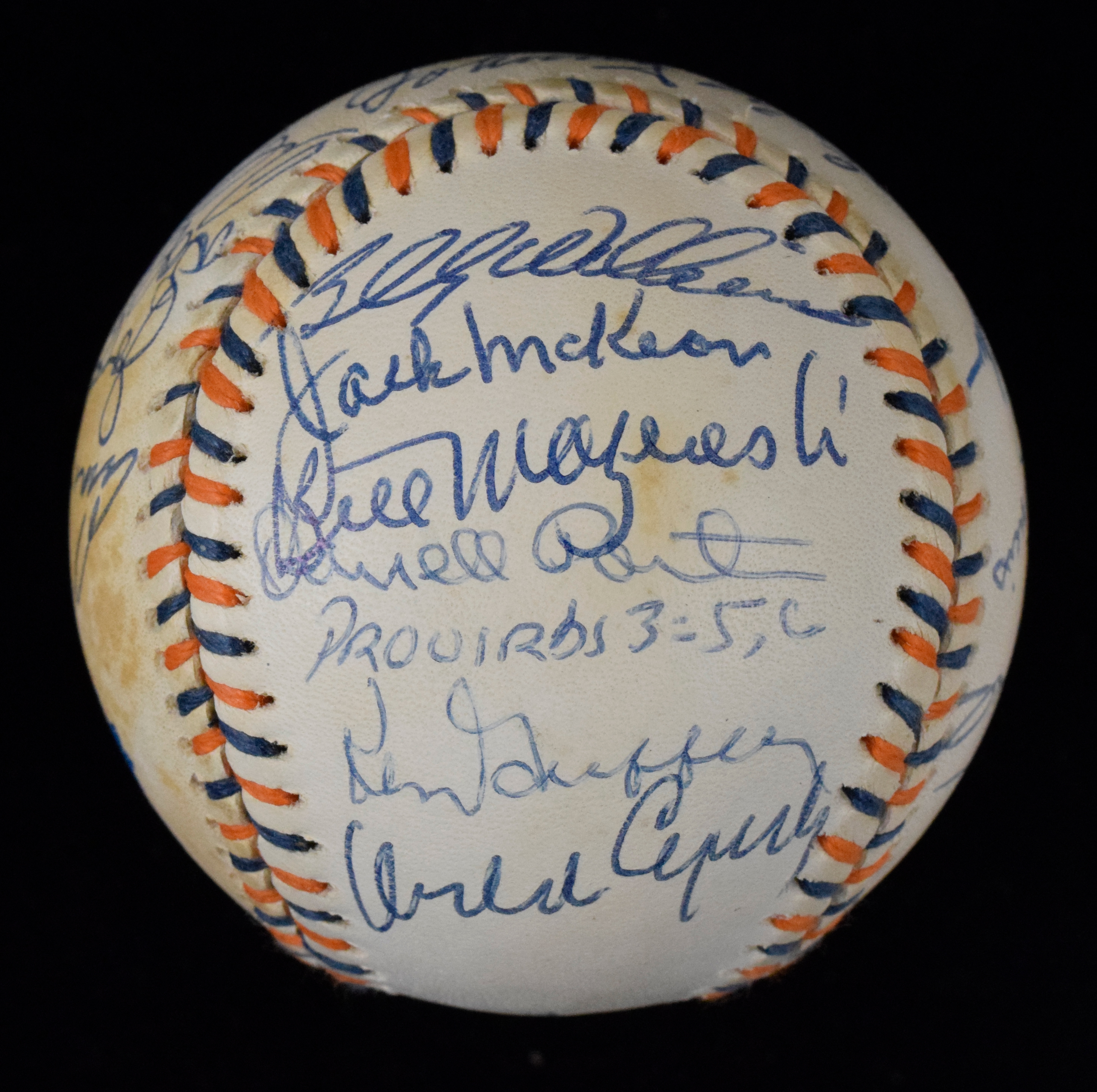 Description:Stars and HOFers multi-signed 1992 All-Star Game baseball (VG/EX). Rawlings official 1992 All-Star Game ball signed by (22) including Johnny Mize, Bob Doerr, Enos Slaughter, Bob Gibson, Bob Lemon, Orlando Cepeda, Bill Mazeroski, Fergie Jenkins, Billy Williams, Dick Williams, Darrell Porter, Darrell Evans, Joe Rudi, Bud Harrelson, Ken Griffey, Bobby Richardson, Steve Rogers, Jim Sundberg, Manny Sanguillen, Bert Campaneris, Jorge Orta, and Jack McKeon. Signatures rate 7/8 to 9/10 out of 10. Areas of toning on each panel: VG/EX