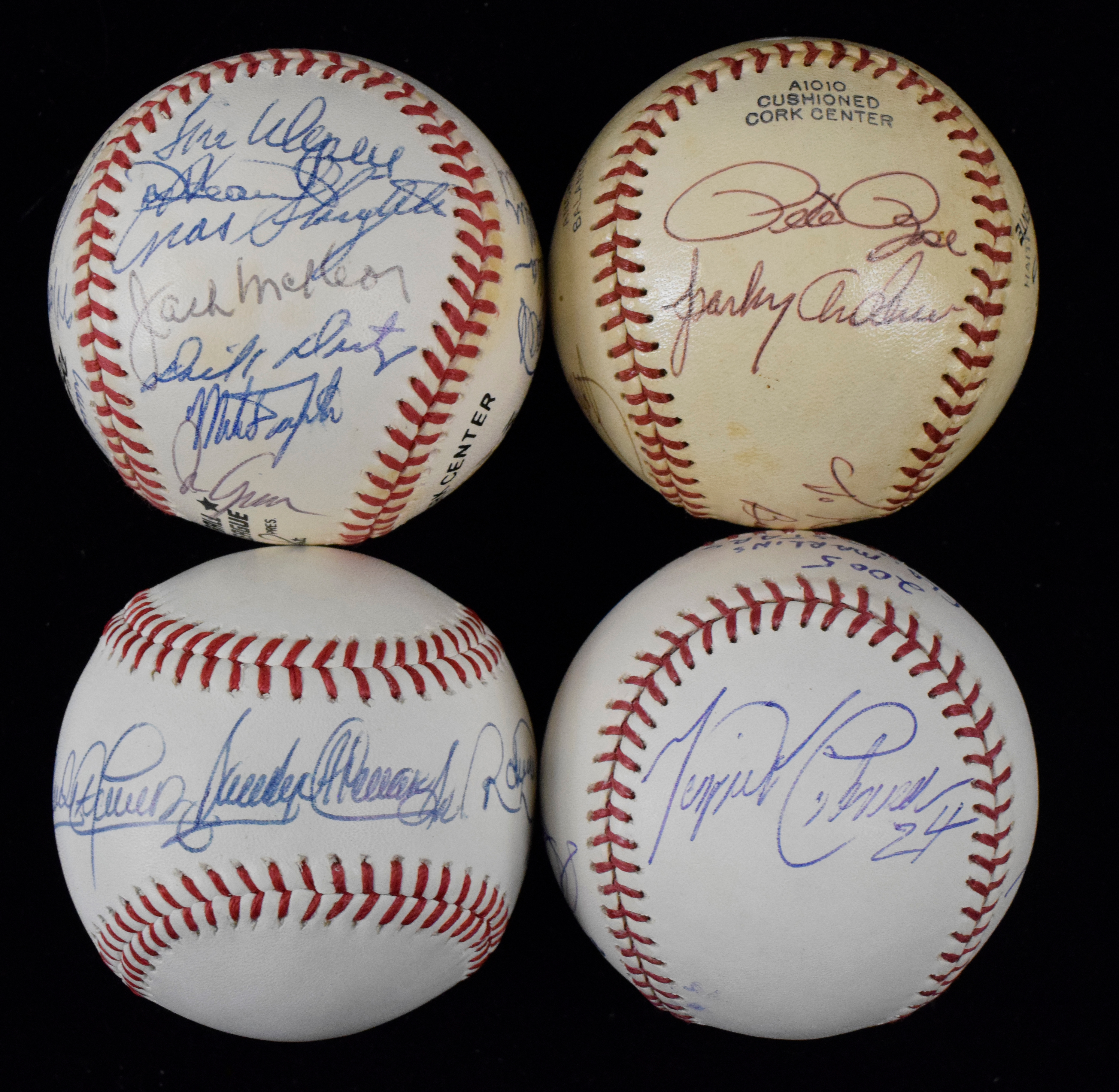 Description:Lot of (5) multi-signed baseballs with HOFers (VG-NM/MT). Includes a Wilson Major League Specifications ball multi-signed by Roberto Alomar, Sandy Alomar Sr, and Sandy Alomar Jr; Wilson c.1970s Puerto Rican League ball multi-signed by Sparky Anderson, Johnny Bench, Tony Perez, and Pete Rose (personalized); B.Selig ML ball multi-signed by 2005 Florida Marlins All-Stars Miguel Cabrera, Dontrelle Willis, Paul LoDuca, and Luis Castillo; C.Feeney NL ball (toned) signed by (8): Luke Appling, Johnny Mize, Lou Brock, Jim Perry, Curt Flood, Luis Tiant, John Roseboro, and Ed Runge; W.White NL ball (toning) signed by (24): Enos Slaughter, Orlando Cepeda, Juan Marichal, Mark Fidrych, Tom Henrich, Moose Skowron, Jim Wynn, Bill Madlock, Kurt Bevacqua, Bill Lee, Blue Moon Odom, Mudcat Grant, Ron Cey, Gary Matthews, Felix Millan, Chuck Hiller, Dick Dietz, Terry Whitfield, Dan Ford, Tito Fuentes, Jack McKeon, and others. Signatures rate 6/7 to 9/10 (avg 8) out of 10: VG-NM/MT