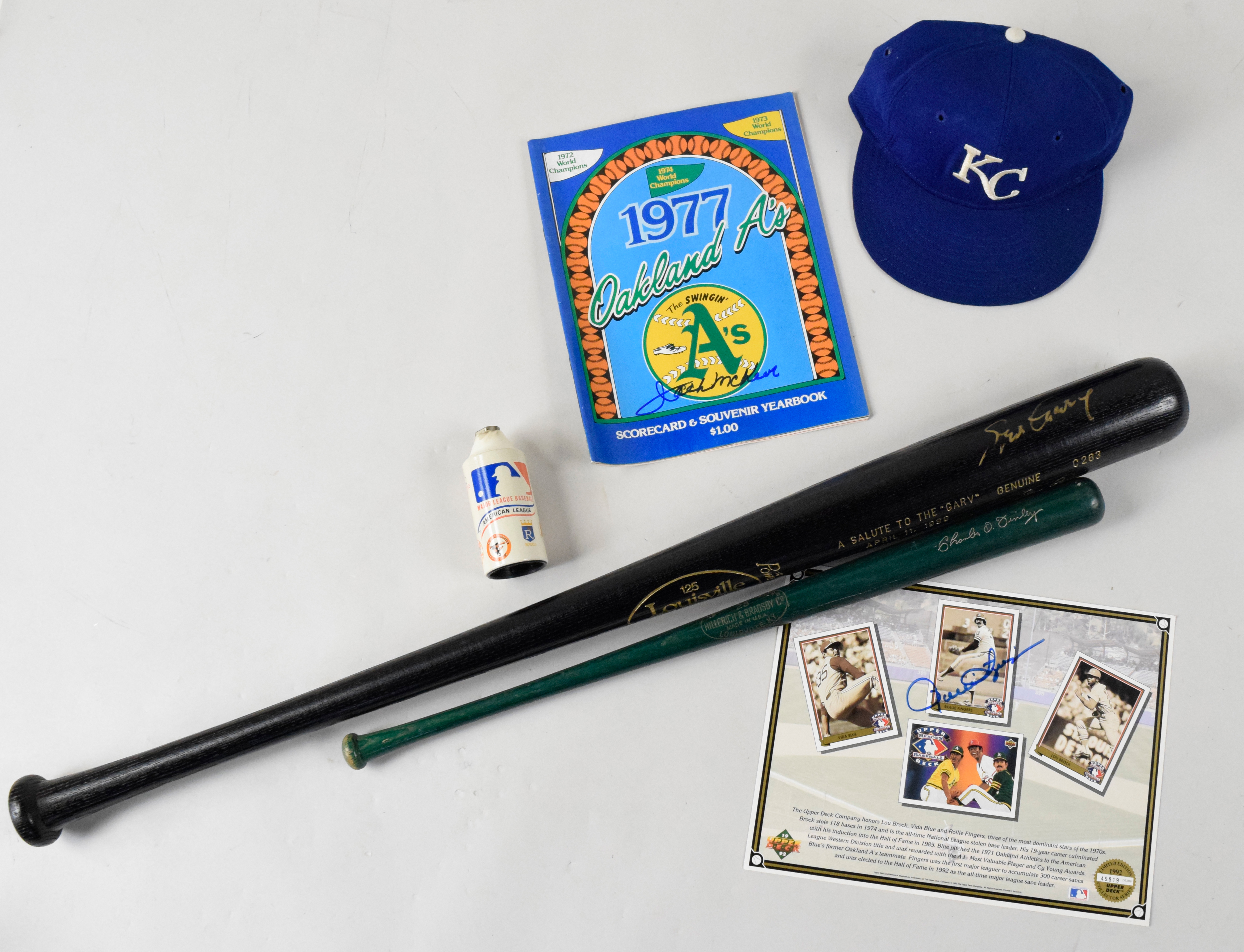 Description:Large lot of assorted baseball memorabilia and autographs (VG-NM/MT). Autographs include (2) 1977 Oakland A's yearbooks signed by Jack McKeon, 34" Louisville Slugger 4/11/1988 "Salute To Garv" bat signed by Steve Garvey (#ed 952/1000), and (5) 8.5"x11" 1992 Upper Deck Baseball Heroes prints signed by Rollie Fingers. Signatures rate 7 to 10 (avg 8) out of 10. Also includes 1965 All-Star Game press pin; (2) 1967 Minnesota Twins souvenir baseballs stamped with facsimile signatures; c.1970s Wilson size 7/1/8 Kansas City Royals hat; c.1970s Louisville Slugger 22" Charles O. Finley mini bat; c.early-mid 1970s American League lighter; 1984 and Mother's Cookies uncut San Diego Padres 28-card sets; Padres 1988 Cabbage Patch Kid; (5) c.1980s-90s bobbleheads: Atlanta Braves, Cincinnati Reds, Kansas City Royals, Oakland Athletics, and San Diago Padres; 27"x41" framed "The Big Red Machine" Looney Tunes print; 16"x20" 2014 Jack McKeon Celebrity Golf Classic plaque (missing a screw); Souvenir pins, off-condition and lesser name signed baseballs, and other items: VG-NM/MT