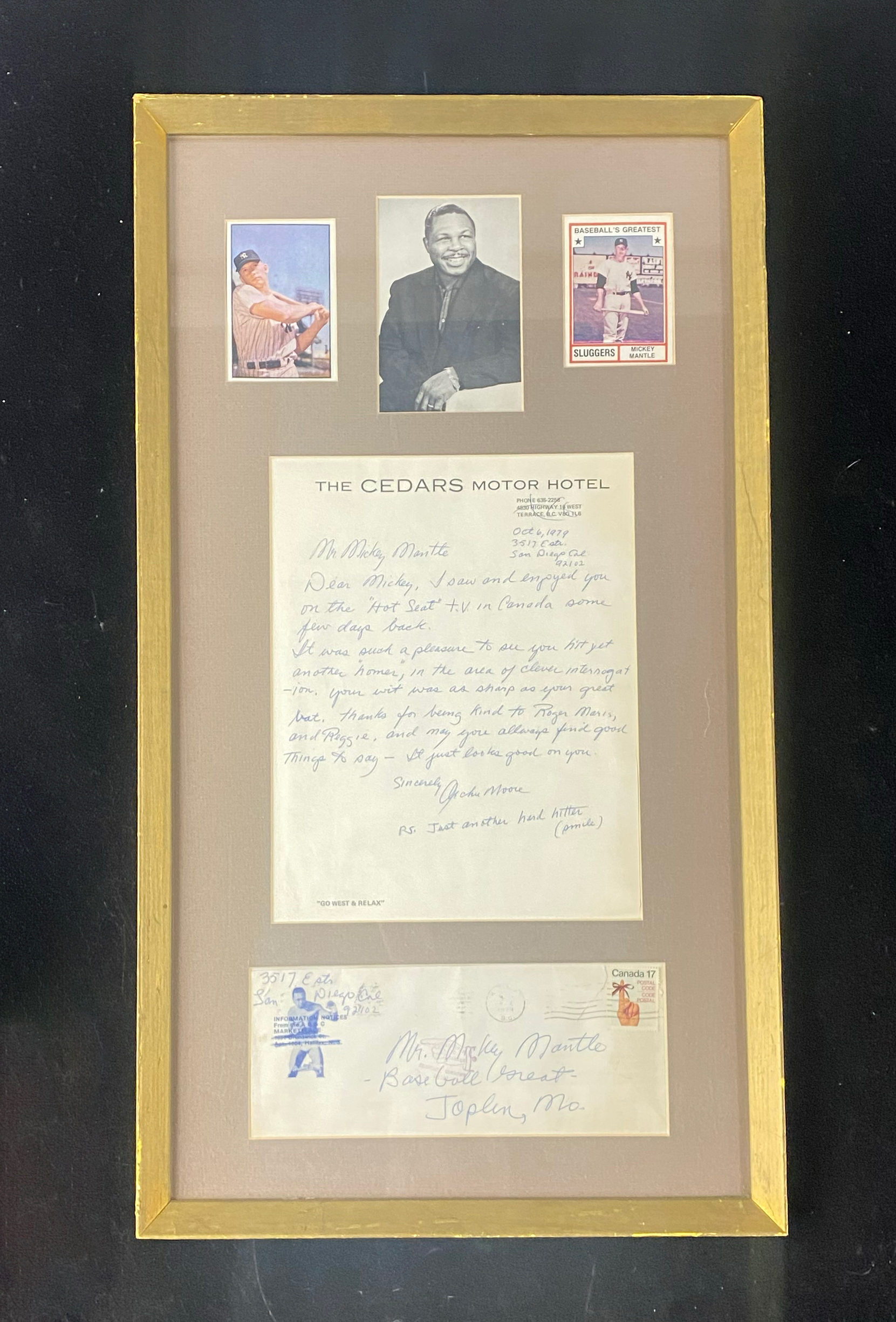 Description:Very nice Archie Moore signed 1979 handwritten letter to Mickey Mantle - JSA (EX/MT framed). Approx. 14"x25.5" framed display containing 10/6/1979 letter which Moore wrote: "Mr. Mickey Mantle" "Dear Mickey, I saw and enjoyed you on the "Hot Seat" tv in Canada some few days back. It was such a pleasure to see you hit yet another "homer", in the area of clever interrogation. Your wit was as sharp as your great bat. Thanks for being kind to Roger Maris, and Reggie, and may you always find good things to say - it just looks good on you" "Sincerely Archie Moore" "P.S. Just another hard hitter (smile)", and includes the original mailing envelope which is addressed to Mr. Mickey Mantle" "Baseball Great" "Joplin, MO" by Moore. Signature rates 9/10 out of 10. Includes full LOA from JSA. Due to framing, complete condition unknown: EX/MT appearance