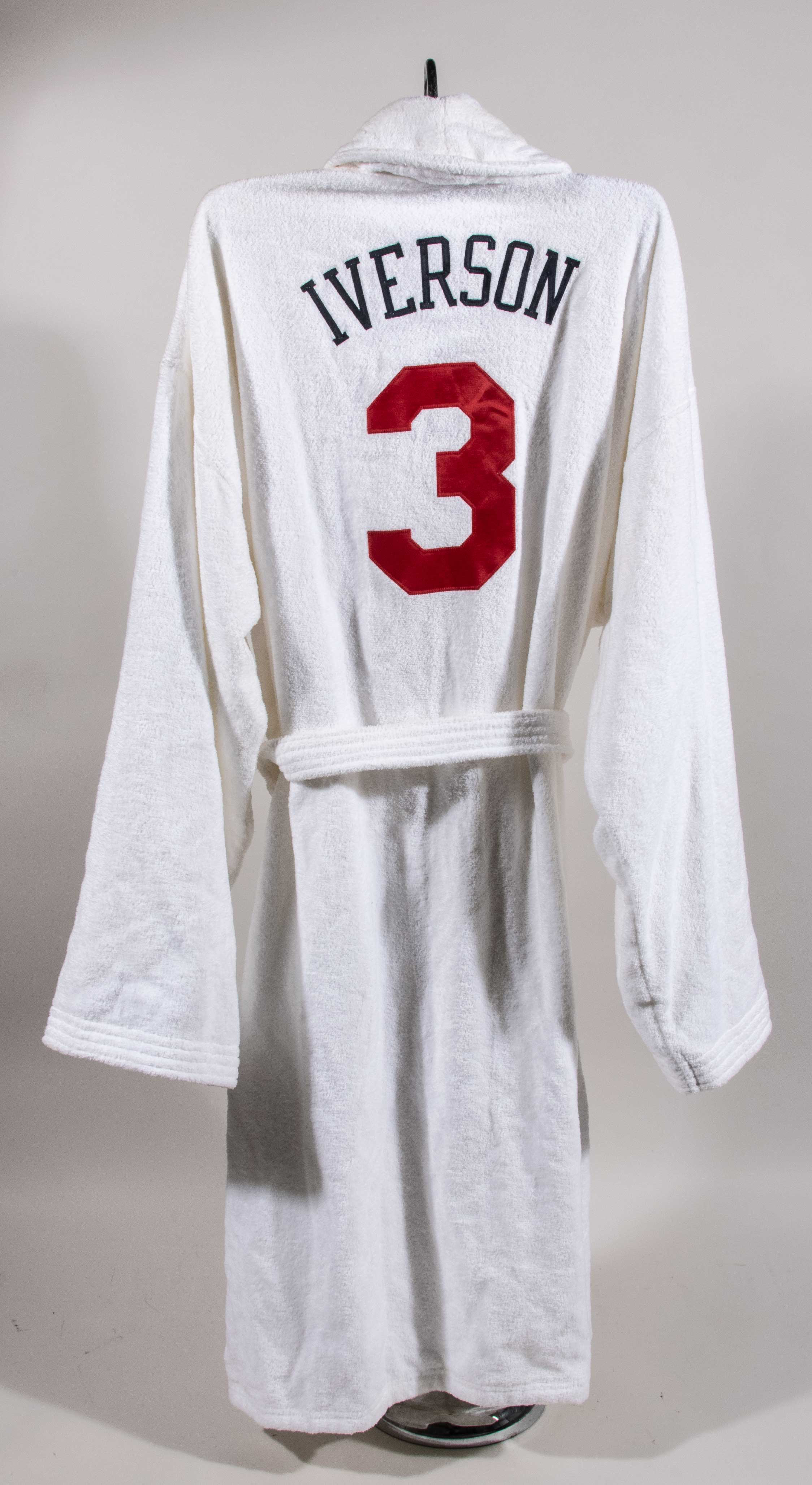 Description:Allen Iverson's Philadelphia 76ers locker room robe (EX). Oxford Imperial Collection brand robe with "SIXERS" sewn across the front, along with "IVERSON" and #3 sewn on the back. Light collar stains as well as a few other scattered stains. Includes LOA from Hunt Auctions: EX