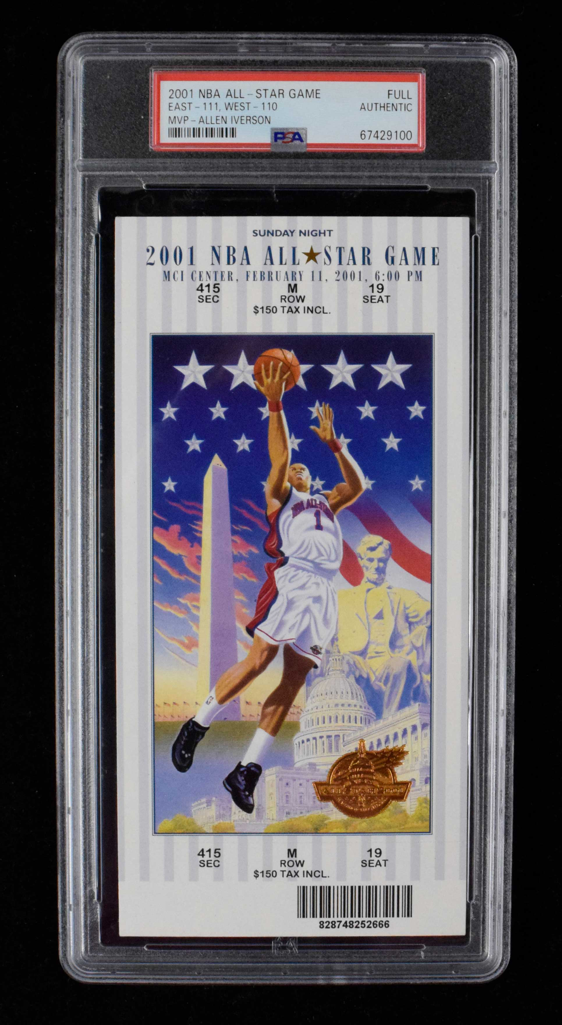 Description:2001 NBA All-Star Game full ticket (PSA Authentic). 2/11/2001 MCI Center full ticket for game in which the East defeated the West by a score of 111-110 behind Allen Iverson's MVP performance scoring 25-points (15 in the last 9 minutes). Authenticated and encapsulated within PSA Authentic holder: NM appearance