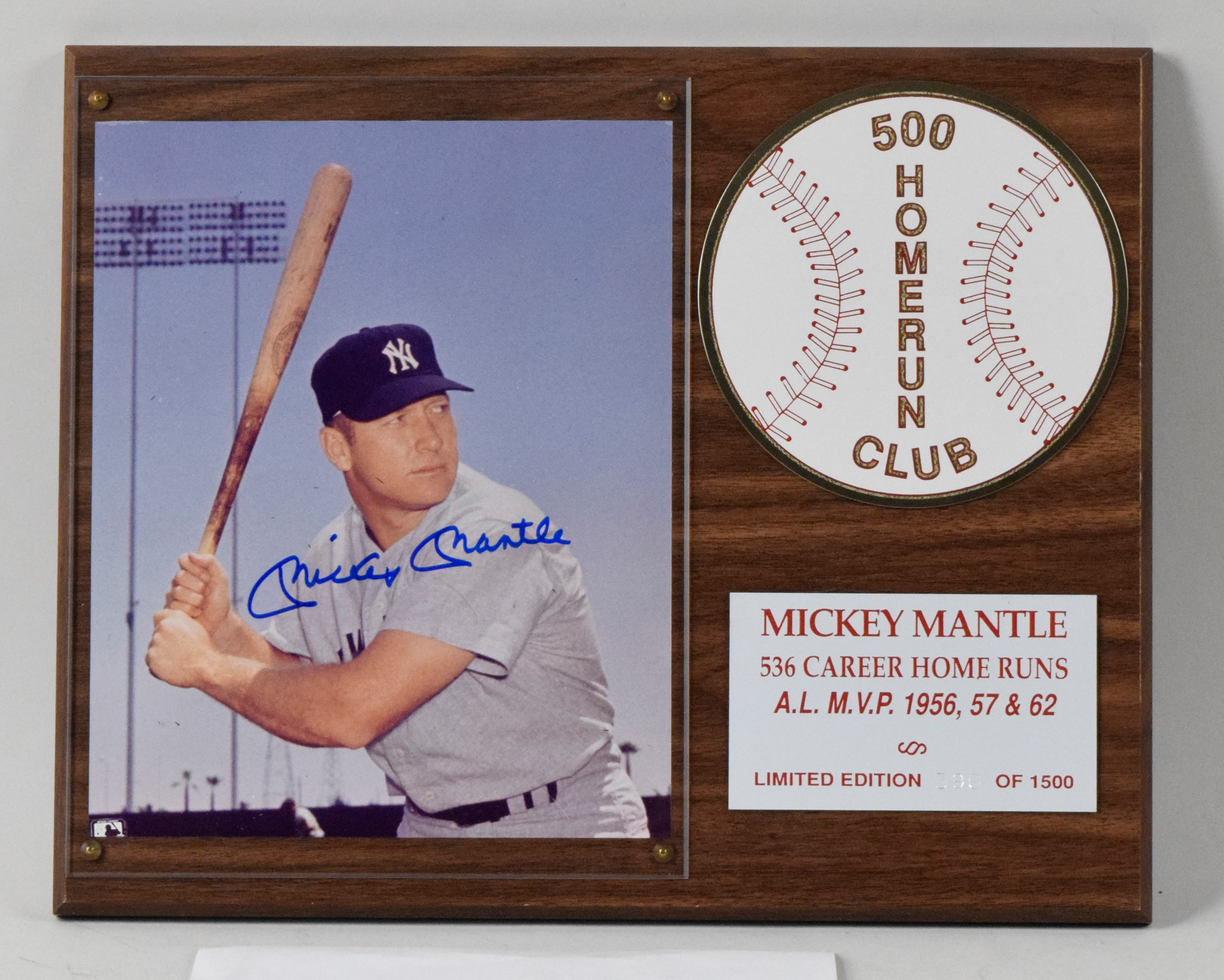 Description:Mickey Mantle signed photo plaque (NM). 12"x15" plaque containing photo signed by Mantle in blue marker. Signature rates 9/10 out of 10. The plaque is #ed 390/1500: NM