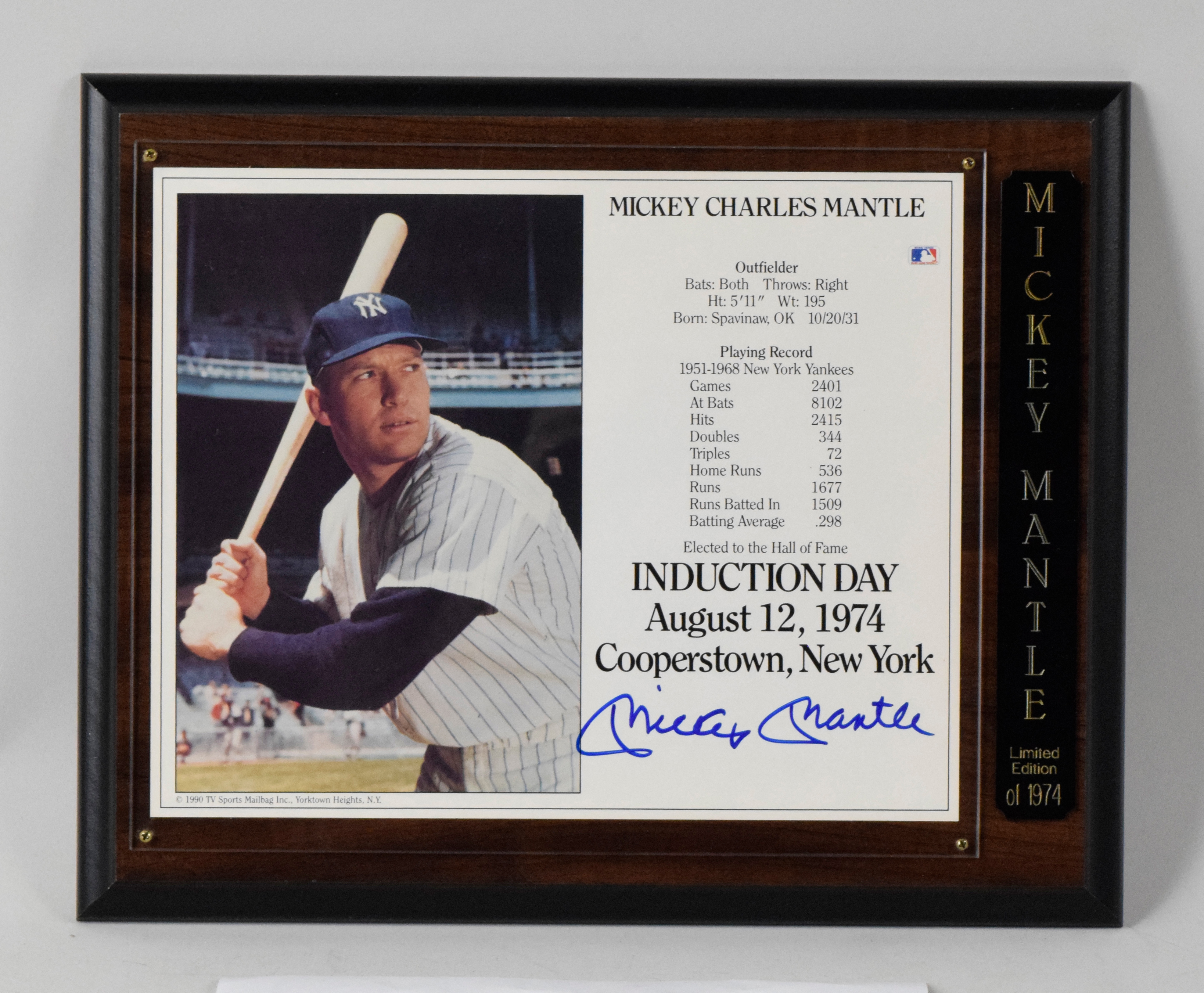 Description:Mickey Mantle signed photo plaque (NM). 10.5"x13" plaque containing photo signed by Mantle in blue marker. Signature rates 9/10 out of 10: NM