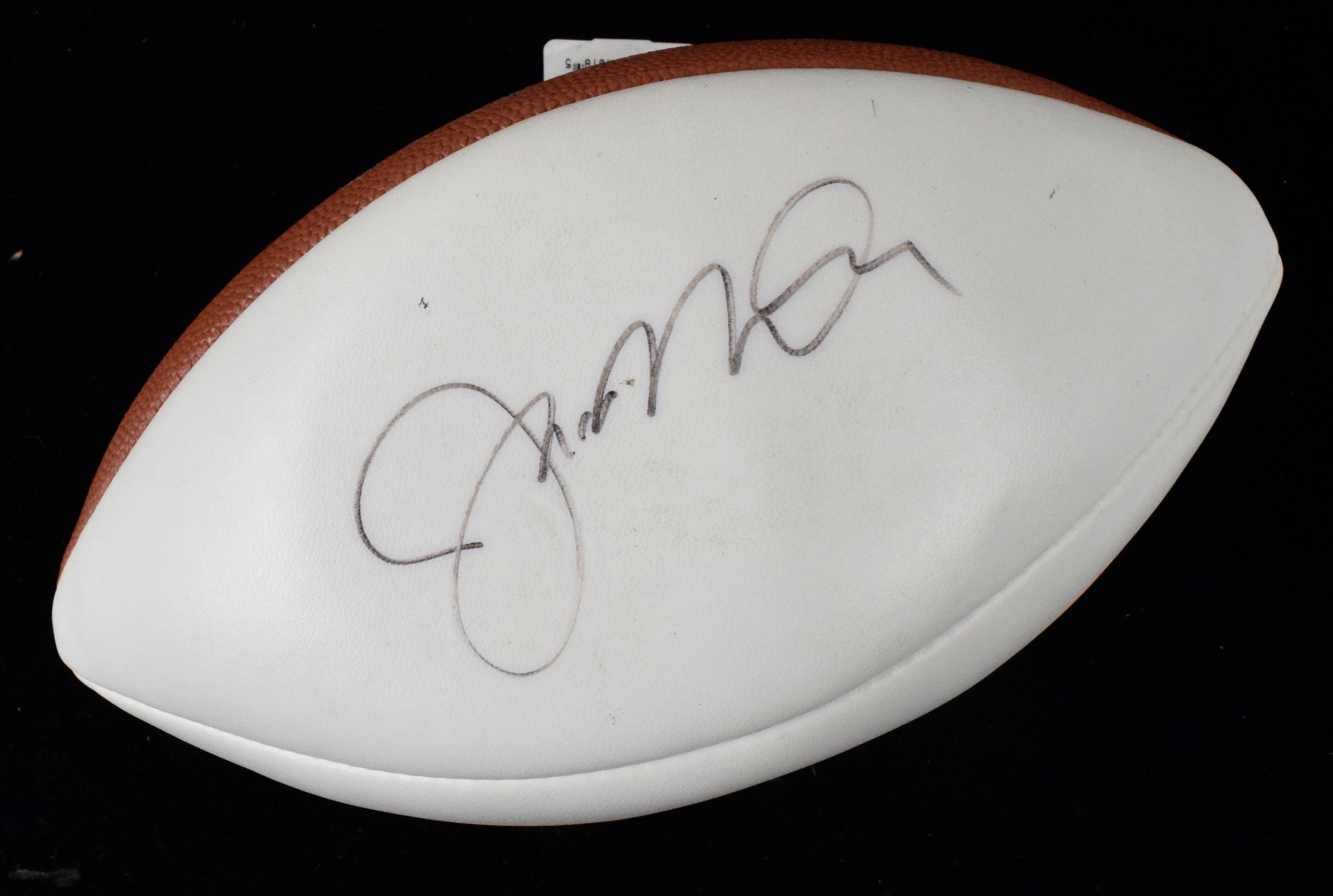 Description:Joe Montana signed Wilson NFL white panel football (EX). Montana signed the ball in black marker. Signature rates 7 out of 10. Minor scuffing on white surface, and not fully inflated: EX