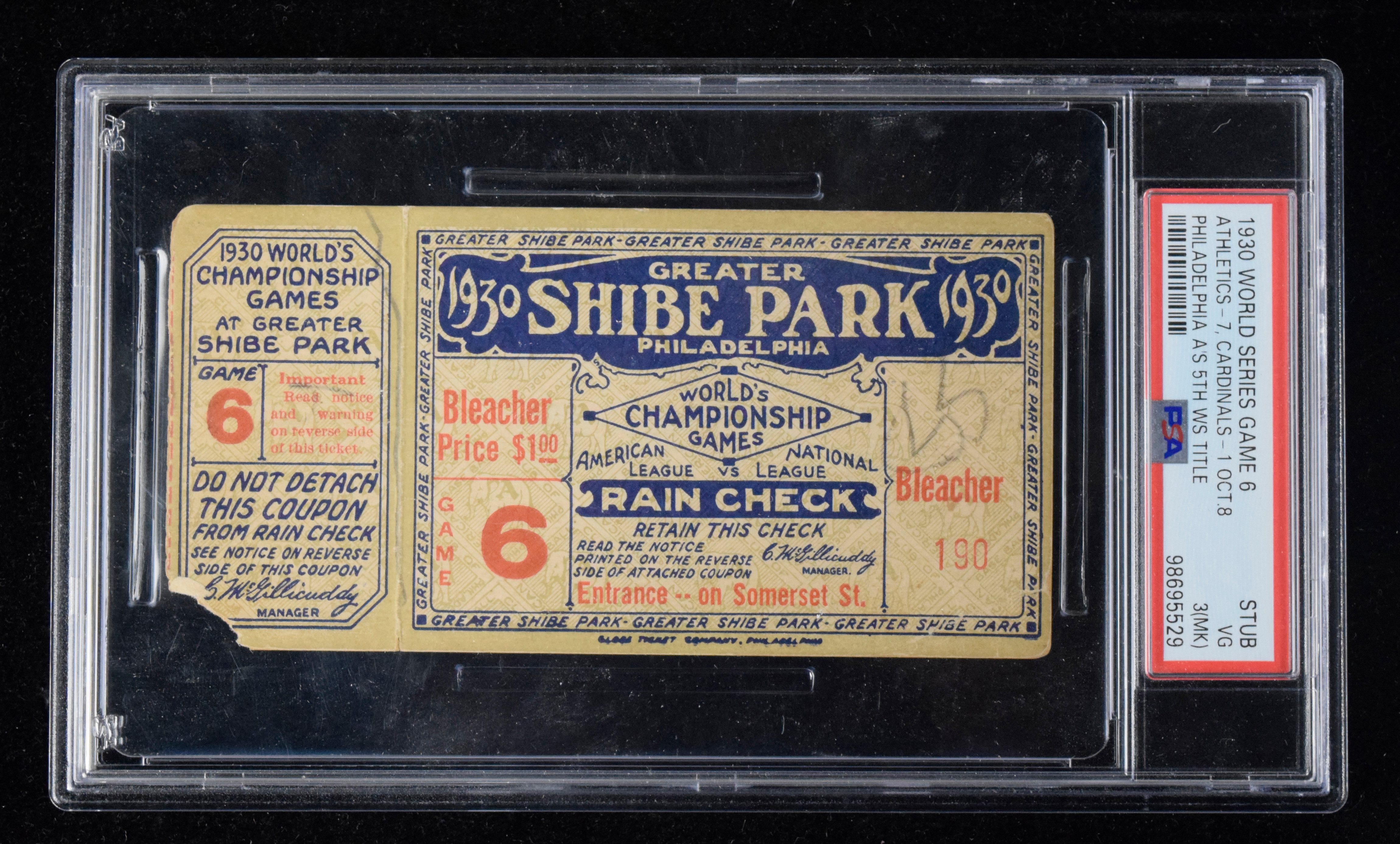 Description:1930 World Series Game 6 ticket stub - A' win the title (PSA 3 VG mk). Shibe Park ticket stub from Game 6 in which the Philadelphia Athletics defeat the St. Louis Cardinals by a score of 7-1 to win the series. Graded VG by PSA with "mk" qualifier due to pencil marks: PSA 3 VG mk
