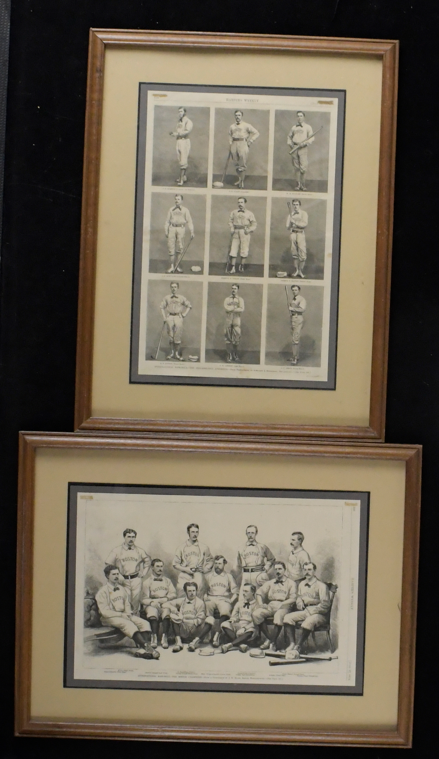 Description:Lot of (2) framed 1874 Harper's Weekly woodcuts (EX-EX/MT appearance). Includes 10"x15" (16.5"x21.5" framed) 6/27/1874 "International Base-Ball - The Boston Champions" picturing Al Spalding, Jim O'Rourke, George Wright, Harry Wright, and others; and 10"x15" 16.5"x21.5" framed) 7/25/1874 "International Base-Ball - The Philadelphia Athletics" picturing Cap Anson and teammates. Due to framing, complete conditions are unknown, but minor edge stains are visible: EX-EX/MT appearance