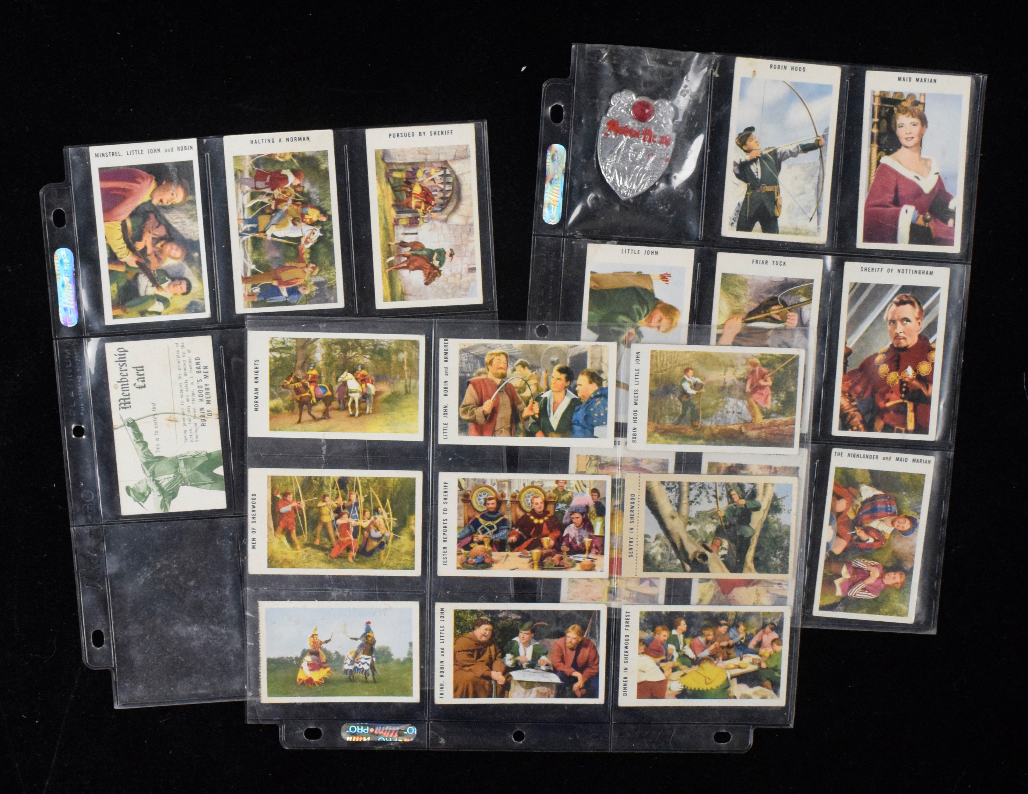 Description:1957 Johnson & Johnson Band-Aid "Robin Hood TV Action Scenes" complete set with pledge card & badge (GD-EX). Includes the 20-card complete set (PR/FR-VG, average G/VG overall), Robin Hood badge (EX), and Sherwood Pledge membership card (GD).