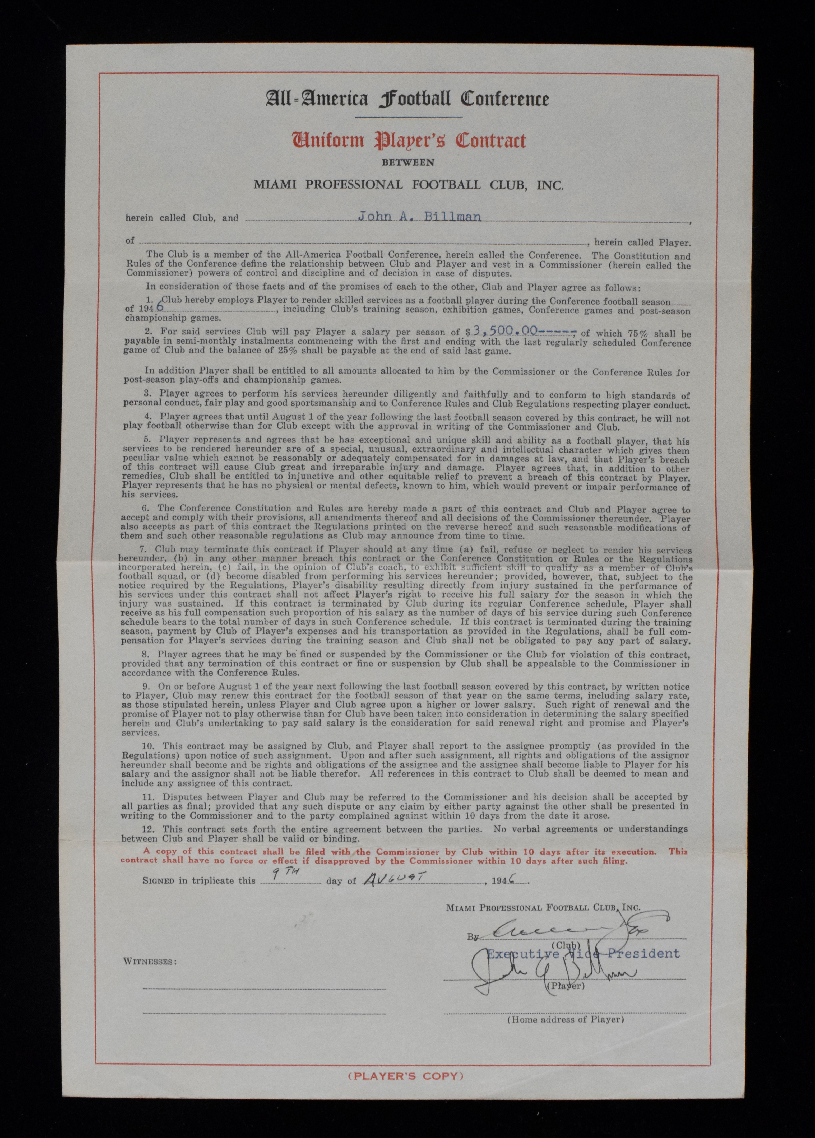 Description:John Billman 1946 Miami Seahawks AAFC contract (EX/MT). All-American Football Conference uniform player's contract signed by Billman in black ink. Signature rates 8 out of 10. Fairly minor wear with horizontal fold crease: EX/MT