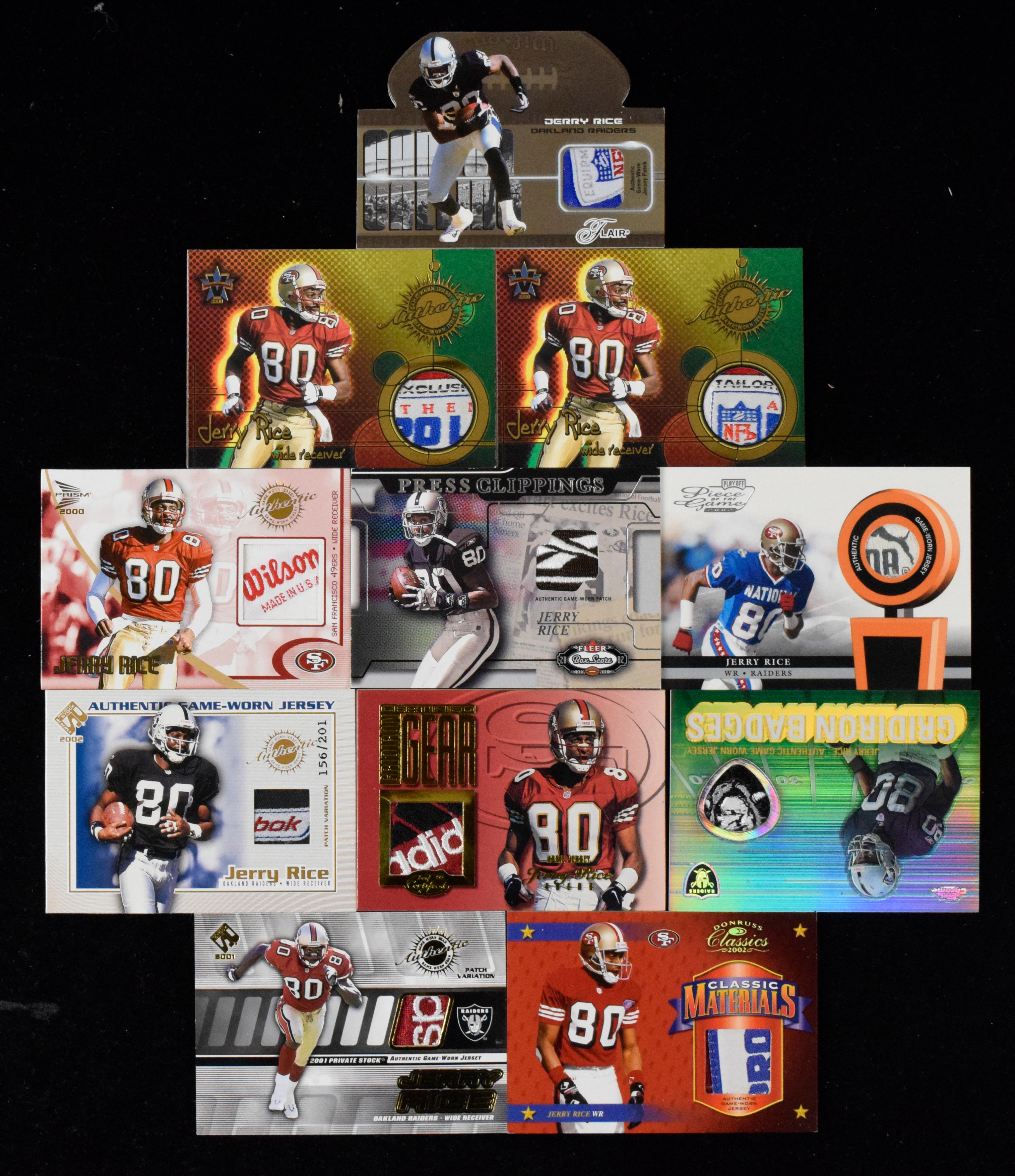 Description:Lot of (11) Jerry Rice patch cards (many numbered) (See description - offered "as is") Nice selection of Jerry Rice patch insert cards, a good number of them with limited edition numbering. Each has what would be considered a very desirable patch including laundry tags, a Raiders logo, and maker/manufacturer tags. They have long resided in an extensive Jerry Rice collection HOWEVER it should be assumed that most, if not all, have had lesser patch pieces removed and these more desirable types inserted after leaving the factory. This lot is offered "as is" with no guarantees: See description - offered "as is" ($500-$1,000)