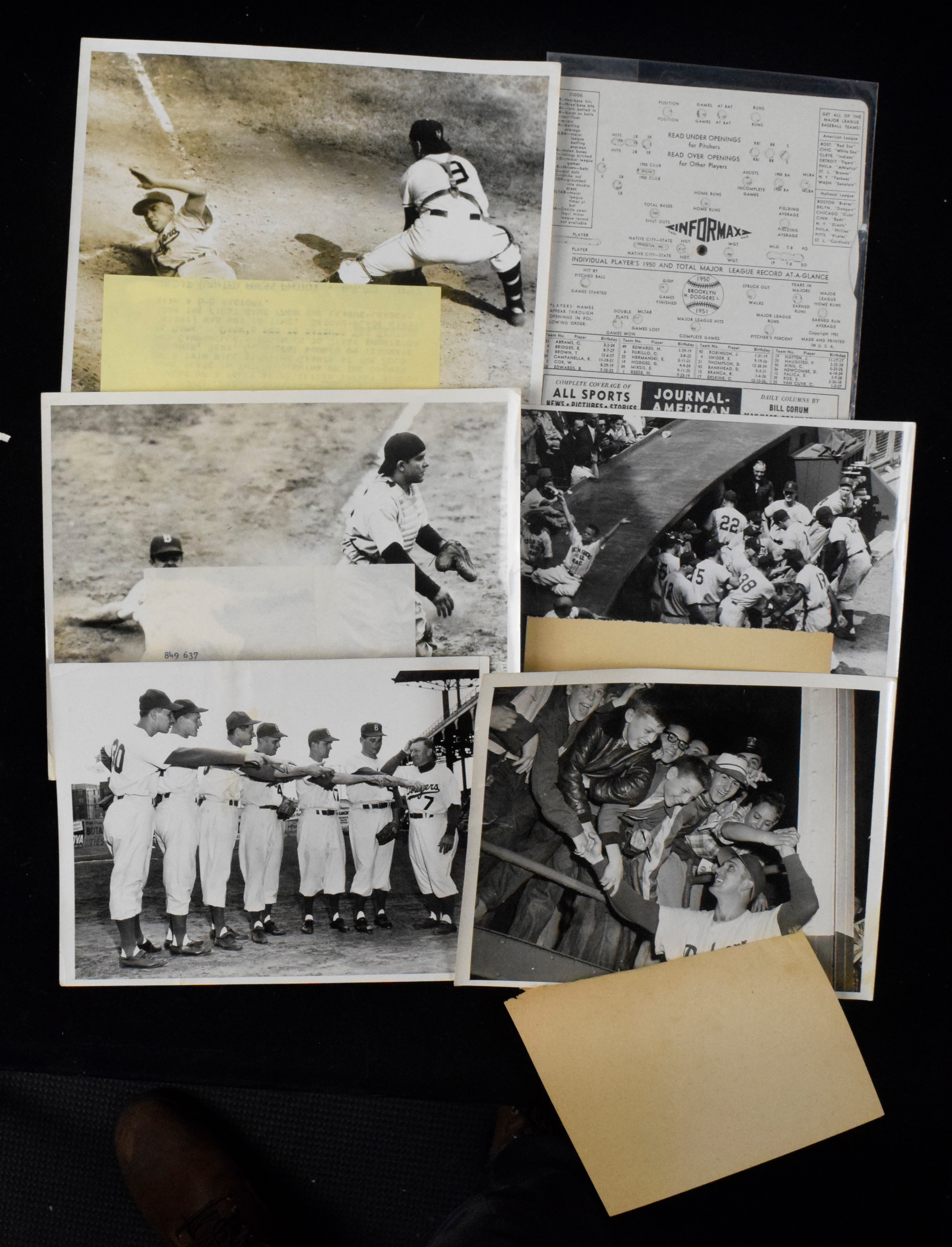 Description:Lot of Brooklyn Dodgers memorabilia from 1942-1956 (VG-NM). Includes 1942 "The Dodger Victory Book" yearbook style publication (EX/MT); (5) vintage press photos: 1947 UPI photo picturing Eddie Miksis sliding across the plate, 1952 UPI photo picturing Pee Wee Reese sliding across the plate, c.1952-53 International News Photo picturing Chuck Dressen with some of his pitchers, 1954 UPI photo picturing Reese being congratulated after game winning HR, and 1956 International News photo picturing Carl Erskine with kids after pitching no-hitter (VG-EX); and 7"x7" 1951 New York Journal-American "Informax" Dodgers info guide (NM).