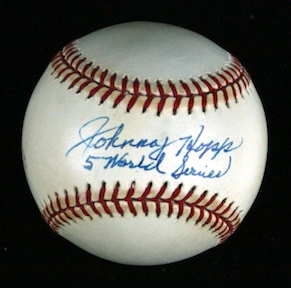 Description:Johnny Hopp single-signed and inscribed L. Coleman NL baseball. (d. 2003) Hopp signed the sweet spot in blue ink and added "5 World Series" inscription. Ball exhibits some scattered toning. Signature rates 8 out of 10. Incl. COA from PSA/DNA (serial #ed sticker is affixed): EX/MT-NM