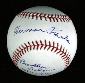 Description:Herman Franks single-signed and inscribed B.Selig MLB baseball. Franks signed the sweet spot in blue ink and added "Brooklyn Dodgers 1940-1941" inscription. Signature rates 8 out of 10. Incl. COA from PSA/DNA (serial #ed sticker is affixed): EX/MT-NM