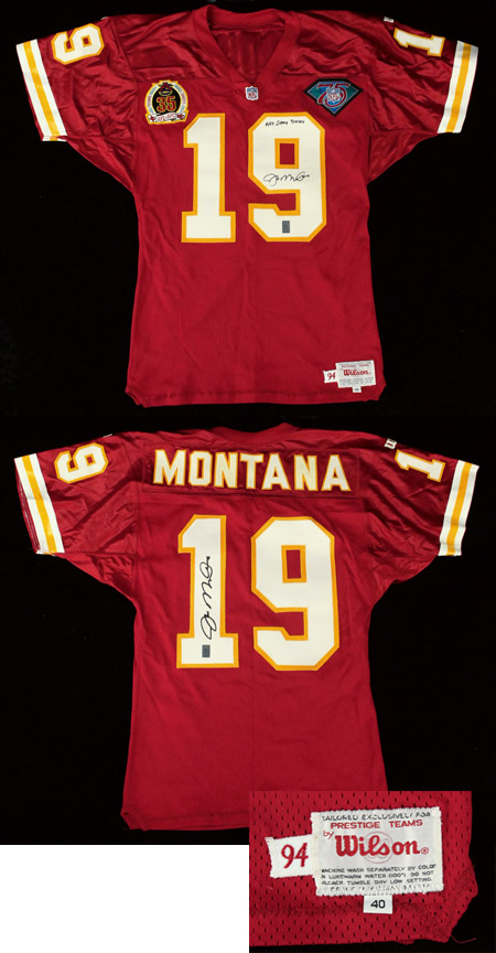 "Montana" nameplate on back. On the front are the "NFL 75" and "Texans Chiefs AFL-AFC 35" anniversary patches. "Wilson" manufacturers tag on front tail along with adjacent year "94" and size "40" tags. Evident usage and wash wear throughout with visible scuffing and light soiling on letters/numbers. Signed on both the front and back numbers in black marker, "Joe Montana" rating 8/9 out of 10 and inscribed on the front "1994 Game Jersey." Montana authentication hologram affixed and includes