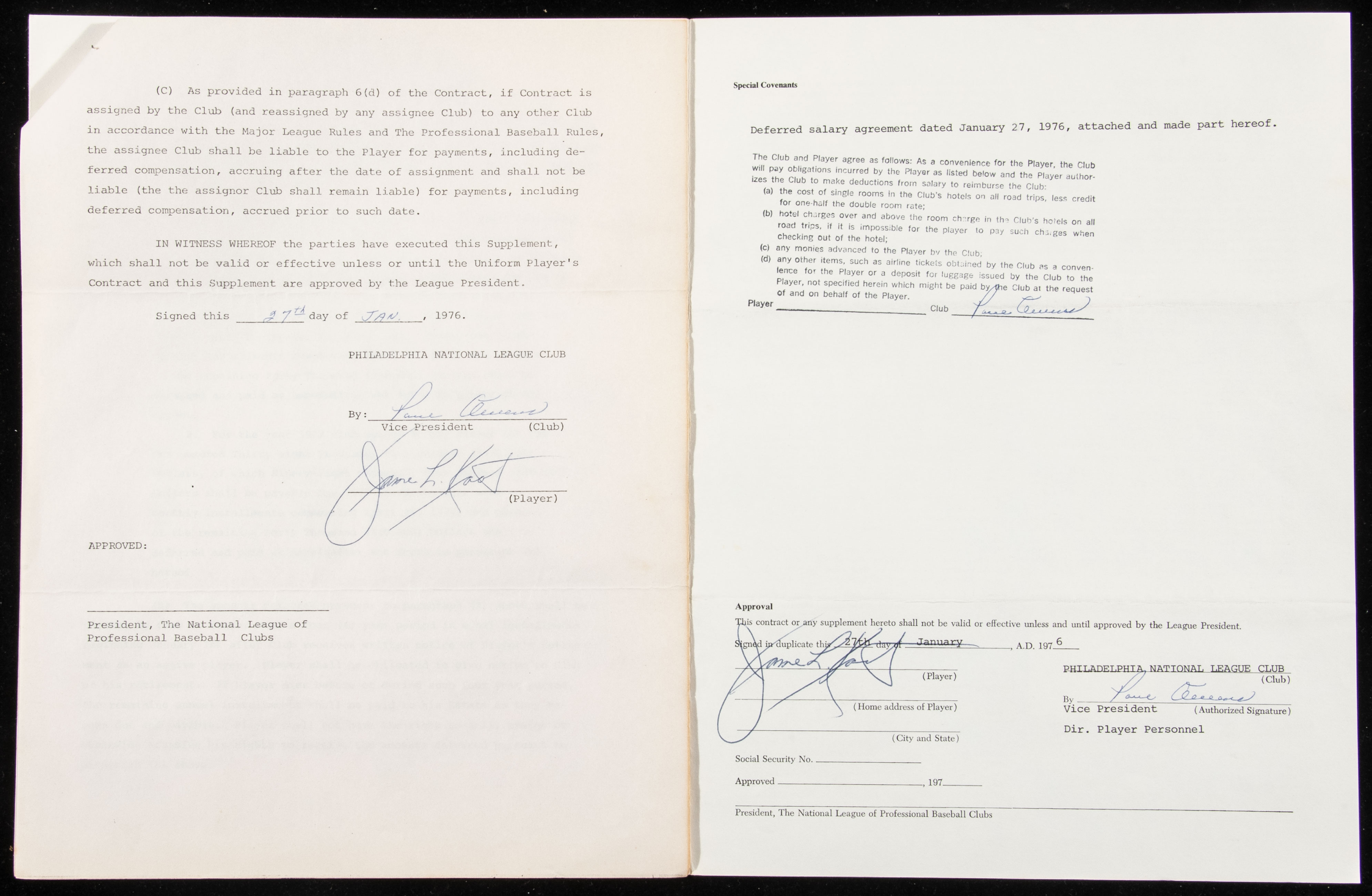 Description:1976-77 Jim Kaat autographed Philadelphia Phillies contract with addendum. Uniform Player's Contract dated January 27, 1976 and executed between Kaat and the Philadelphia Phillies. Signed "James L Kaat" inside along with Paul Owens (twice) on behalf of the team. Also includes an addendum (regarding dates of payments) which is also signed by both Kaat and Owens. Signatures rate 8 to 9 out of 10. Light handling and storage wear. Kaat would earn a pair of Gold Gloves playing with the Phillies during the time span of this agreement. Includes auction LOA from JSA and signed letter of provenance from Jim Kaat: Sigs. NM, Contract EX