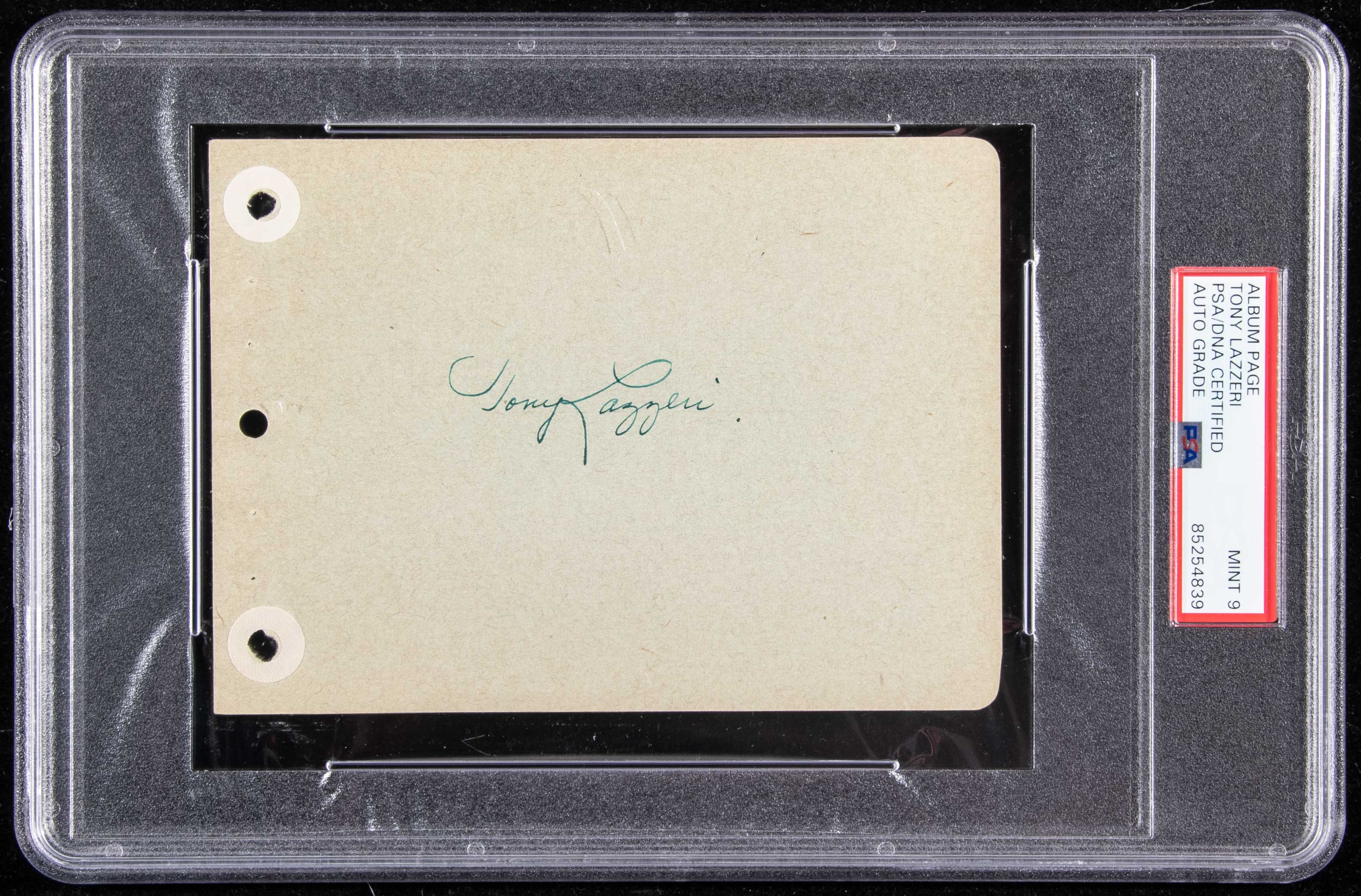 Description:Tony Lazzeri autographed album page (PSA/DNA Mint 9). Crisp and bold fountain pen signature appears on vintage album page showing little mentionable wear. Lazzeri was a key member of the New York Yankees for over a decade and helped formed the core of "Murders Row", their devasting lineup which dominated the American League throughout the late 1920s and early 30s. In all he played on (6) of their pennant winning teams, (5) of which went on to win the World Series. Authenticated, graded, and encapsulated by PSA/DNA: PSA/DNA Mint 9