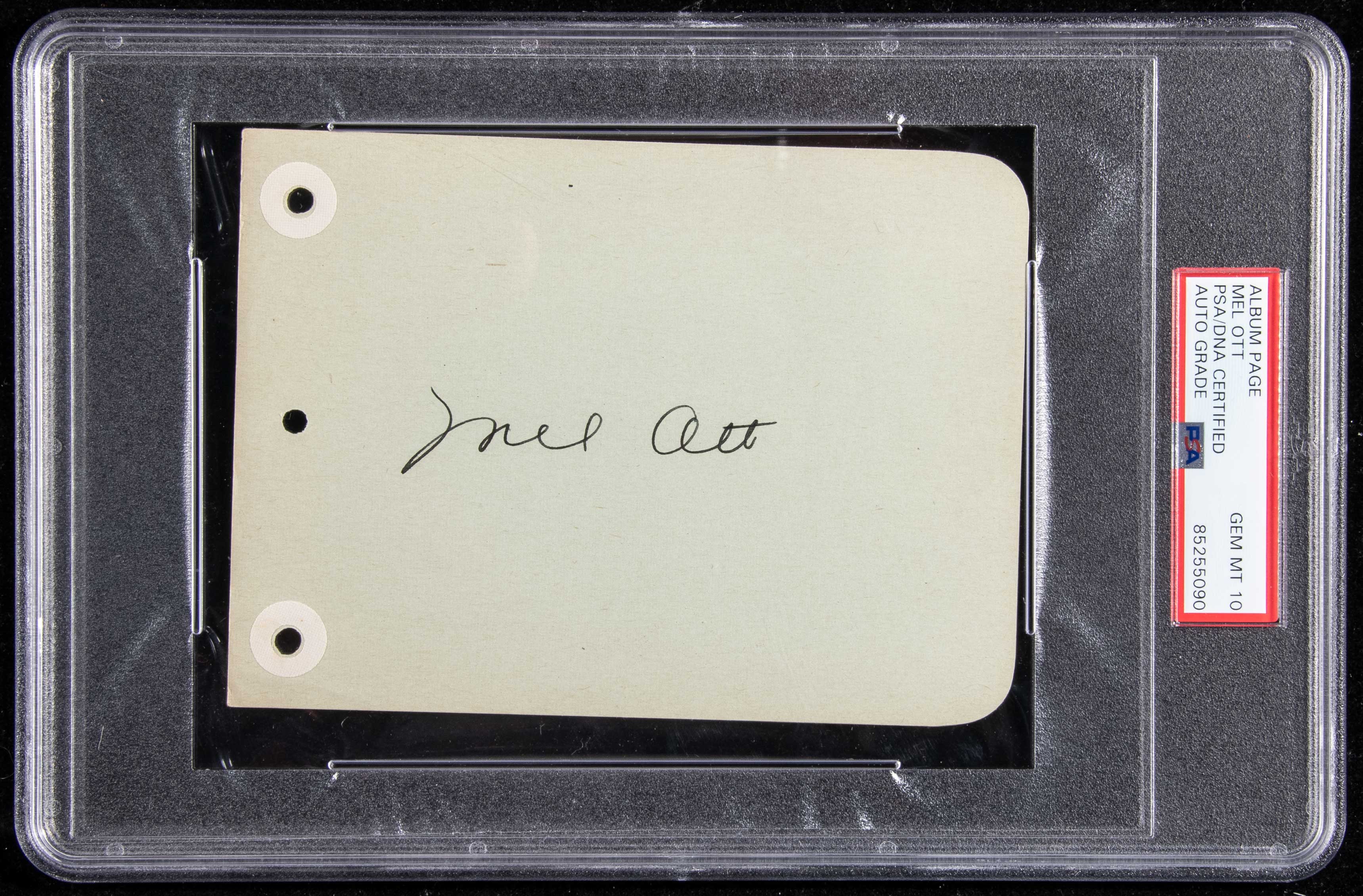 Description:Mel Ott autographed album page (PSA/DNA Gem Mint 10). Flawless signature is done in fountain pen on album page showing a hint of light wear. Ott spent (22) seasons with the New York Giants and was one of the greatest National League power hitters of the era. He lead the League in home runs (6) times (a record at the time) and was the first NL player in history to reach the lofty plateau of (500). Authenticated, graded, and encapsulated by PSA/DNA: PSA/DNA Gem Mint 10