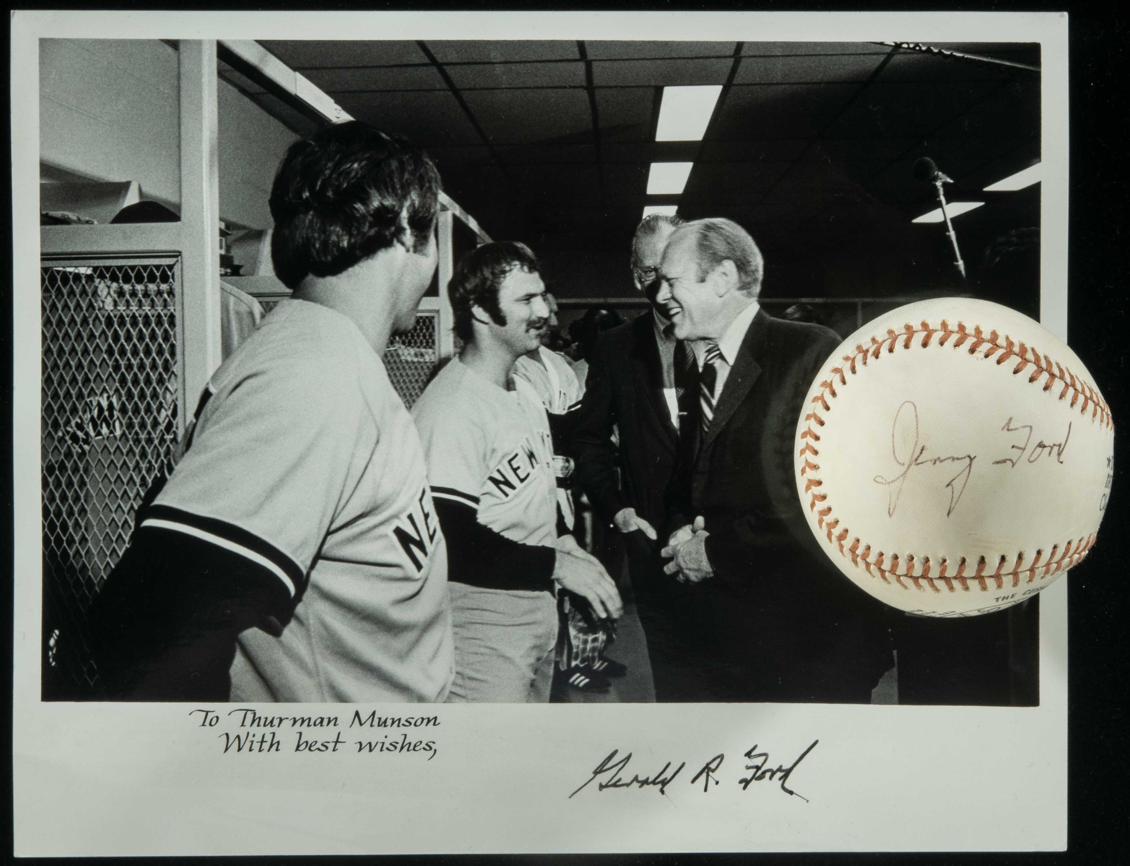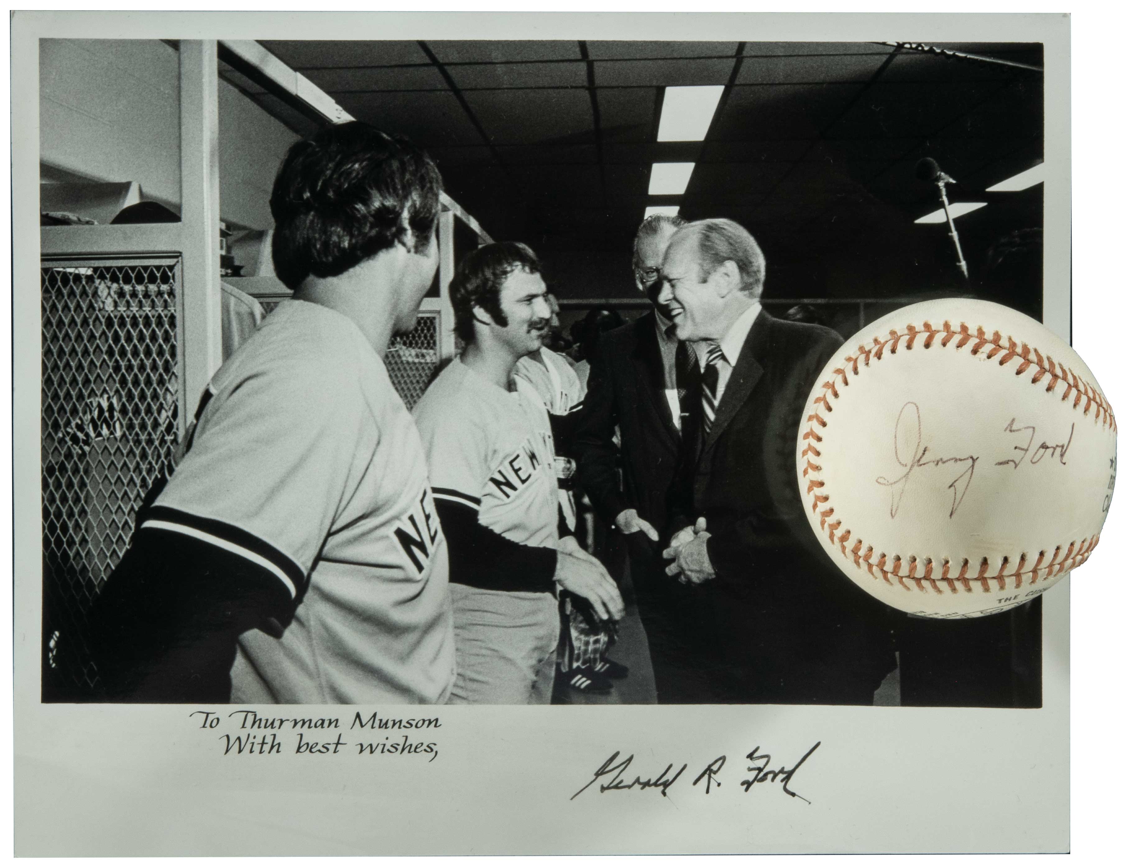 Description:President Gerald Ford single signed 1976 All-Star Game Ceremonial baseball and related photograph. (Ex-Thurman Munson Collection)(PSA/DNA 8 NM-MT) The 1976 All-Star game was played at Veteran's Stadium in Philadelphia before a huge crowd in celebration of the nation's bicentennial. President Gerald Ford was on hand to throw out the ceremonial first pitch. The lot includes an unused Feeney NL baseball signed on a side panel by President Ford in black ink rating 8 out of 10. Also included is a black and white 8"x10" photo picturing the President in the American League locker room with Munson and others. The photo is secretarially signed "Gerald Ford" with pre-printed "To Thurman Munson, With Best Wishes" salutation. Based on the fact that the NL batted first, we believe the offered ball may have been thrown by the President to Thurman Munson (AL starting catcher) for the ceremonial first pitch. Very fine historical baseball with impeccable provenance. Includes full LOA from PSA/DNA for baseball (8 NM-MT) along with letter of provenance from Diana Munson and signed letter of provenance from Geddy Lee: NM-NM/MT