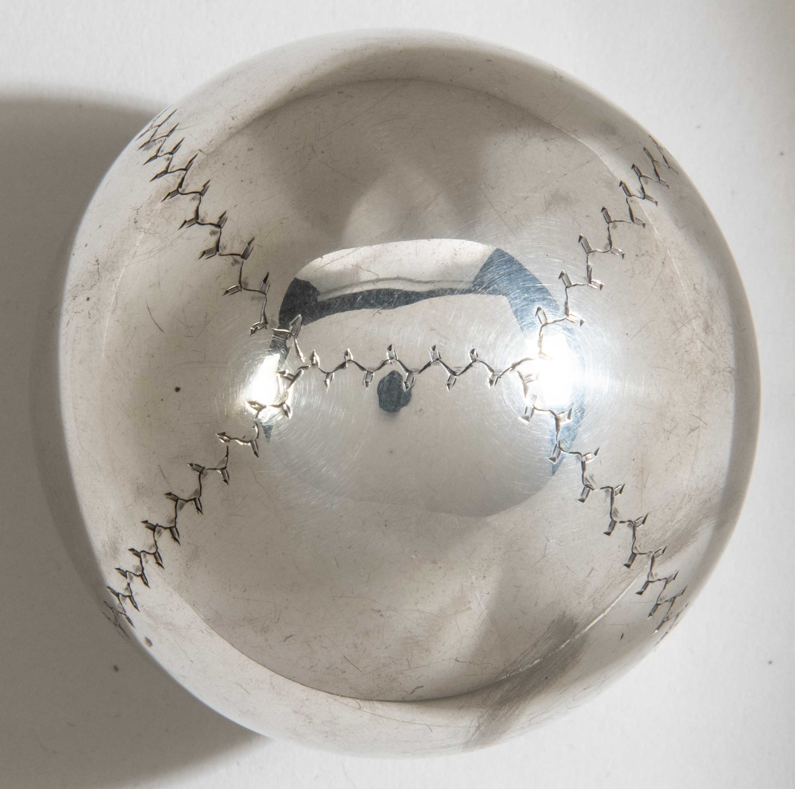 Description:Franklin County Base Ball Association silver trophy ball c.1867. Presentational ball done in metal is engraved, "Franklin County Base Ball Association, Organized 1867." Simulated stitching is likewise etched into the surface in the manner of a lemon peel baseball. The piece remains in outstanding condition with just a hint of light handling wear and is by far the best preserved example among those offered in this sale (which collectively account for a significant portion of surviving silverplate trophy balls). The 1860s represent baseball's formative years and the first professional team was not founded until the last year of that decade. In its' infancy the game was played by amateurs in contests throughout the Country. An article published on May 27, 1867 relays that "the first contest for the Silver Ball, purchased by the Franklin County Base Ball Association...was won by the Notunck Club." This infers that the ball was intended to be passed from winning team to winning team and would explain why no specific team name is engraved in the piece: EX/MT