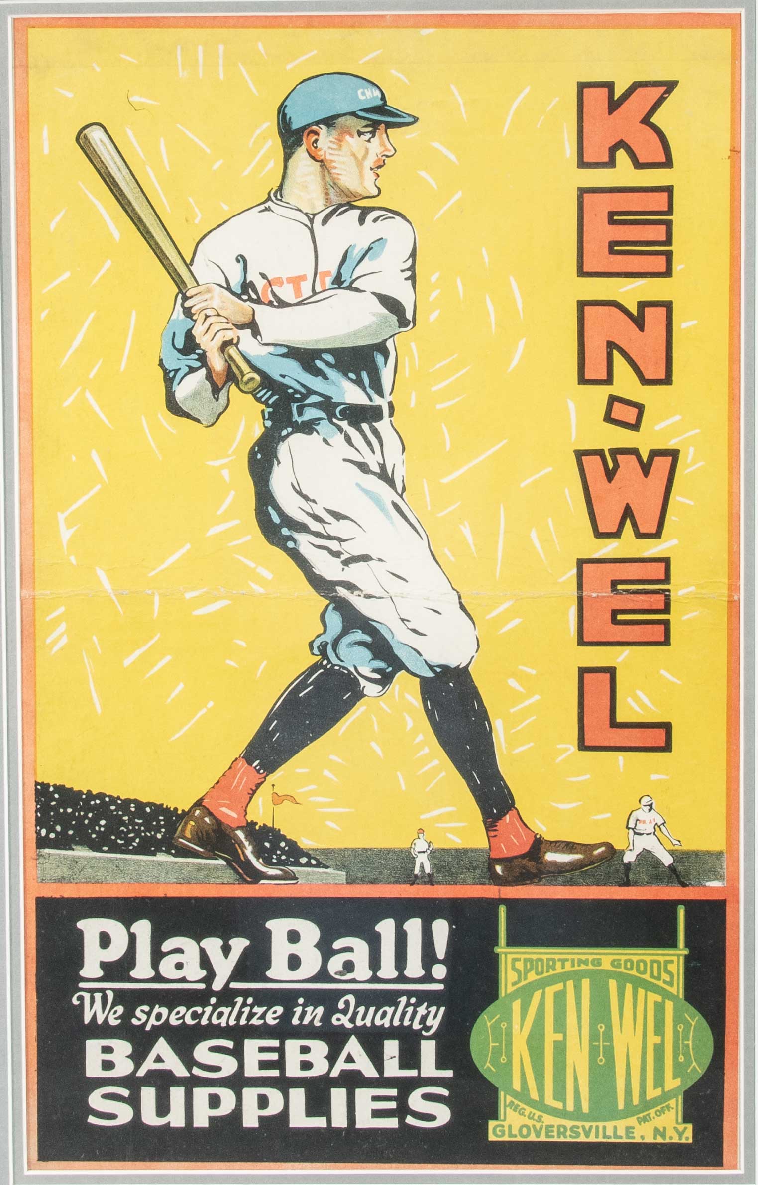 Description:Ken-Wel Sporting Goods advertising poster c.1920-1930s. Appealing large format advertising display featuring a batter set against yellow background with players/spectators at his feet and "Ken-Wel" company name lettered in large font at side. Batter bears resemblance to Lou Gehrig who was an endorsee of Ken-Wel brand gloves. Bottom portion has company logo and "Play Ball! We specialize in quality Baseball Supplies" titling. Offers fine display qualities with majority of wear coming in the form of horizontal creasing at middle and strip of moderate toning at top. Visible area measures 12.5"x20.5", framed to 23"x30" overall. Vintage frame has some paint loss: Technical GD with far superior eye appeal