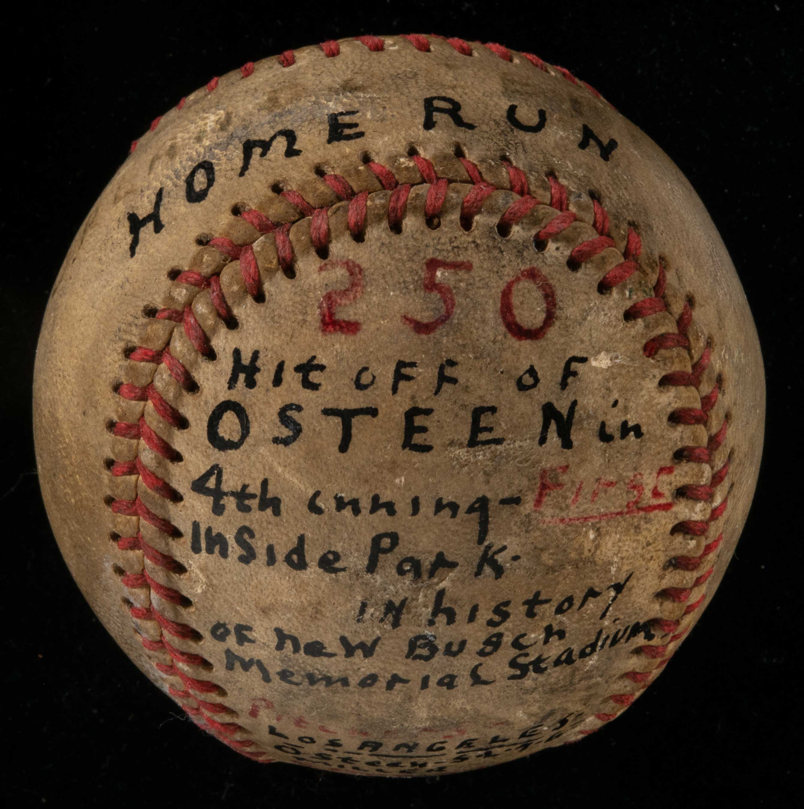 Description:Orlando Cepeda's 250th career home run baseball. W.Giles NL ball with "Home Run" written on the sweet spot, "250 Hit Off Of Osteen in 4th inning" "First Inside Park in history of new Busch Memorial Stadium...." written on the panel below, and the opposite side panel having the line score, "June - 9, 1967" game date, and other game info. Soiled surface, with Spalding/Giles stampings still visible. Includes certificate of provenance from the Cepeda family: VG/EX