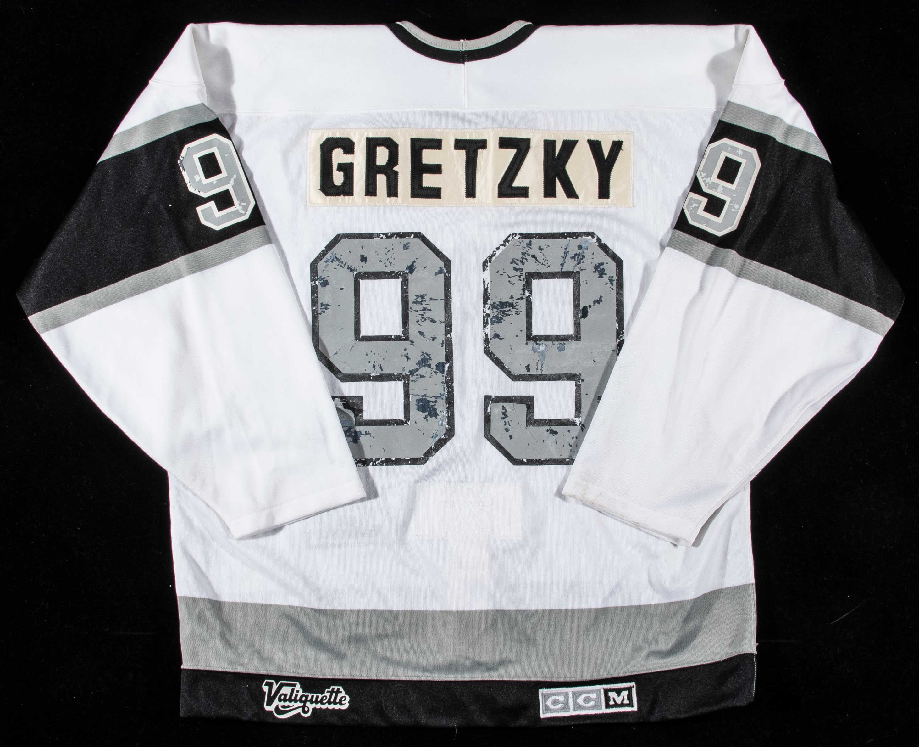 Description:Wayne Gretzky c.1988-92 Hull Olympiques presentational jersey. CCM size 50 Hull #99 Wayne Gretzky professional quality jersey with "C" captain patch on front, and fight strap within the interior. Gretzky owned the QMJHL team from 1985-1992, and changed the team colors to match those of the Los Angeles Kings upon his trade to the team in 1988. Heavy flaking to the #99 on the back. Includes certificate of provenance from the Romanski family: VG/EX