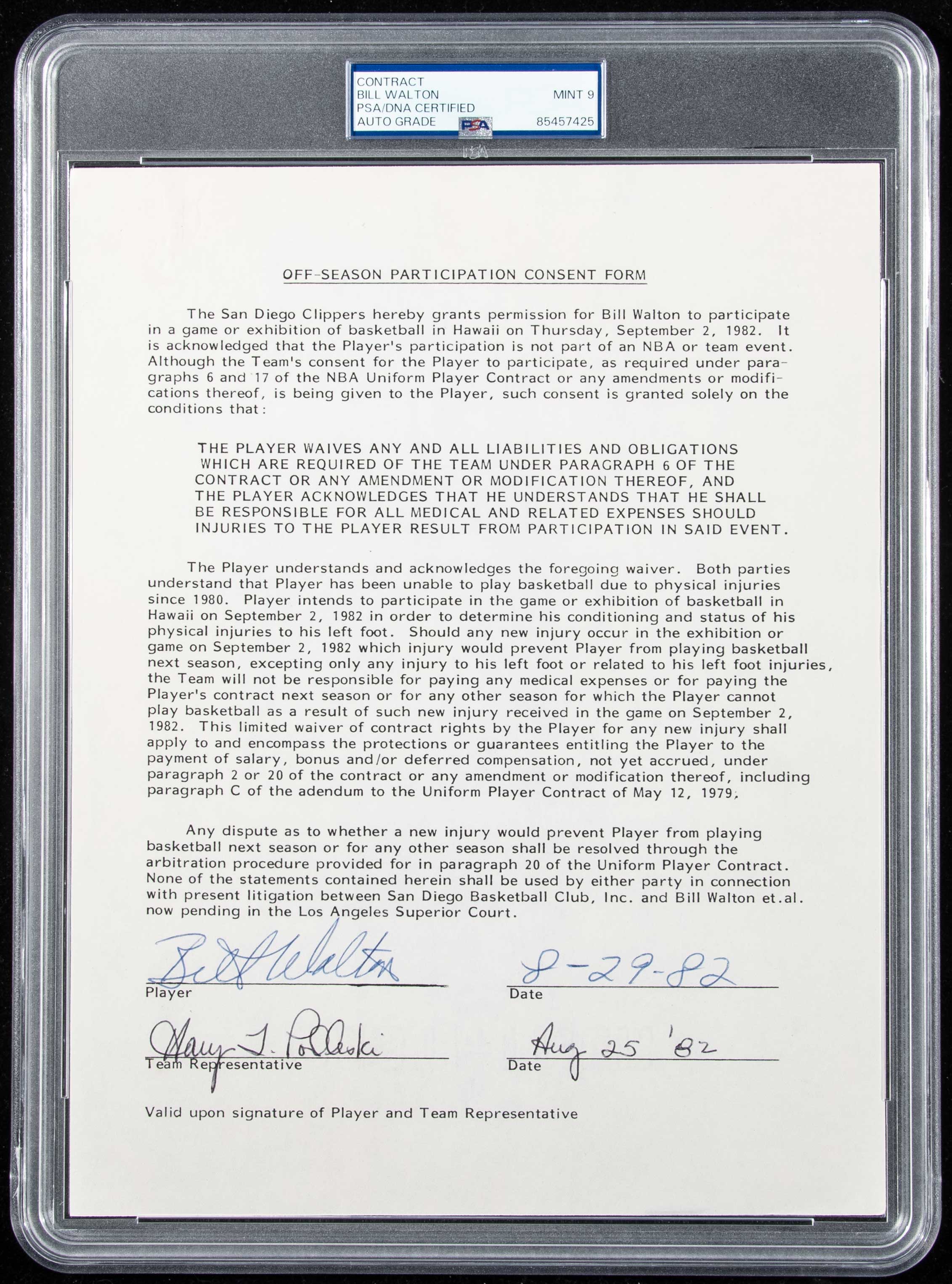 Description:1982 Bill Walton autographed San Diego Clippers Off-Season Participation Consent Form (PSA/DNA 9 MINT). One page typewritten consent form regarding Walton's off-season activities having been signed and dated by Walton at the bottom in blue ink rating 9 out of 10 . Also countersigned by a team official. Encapsulated by PSA/DNA (9 MINT) an includes certificate of provenance from Walton Family: MT