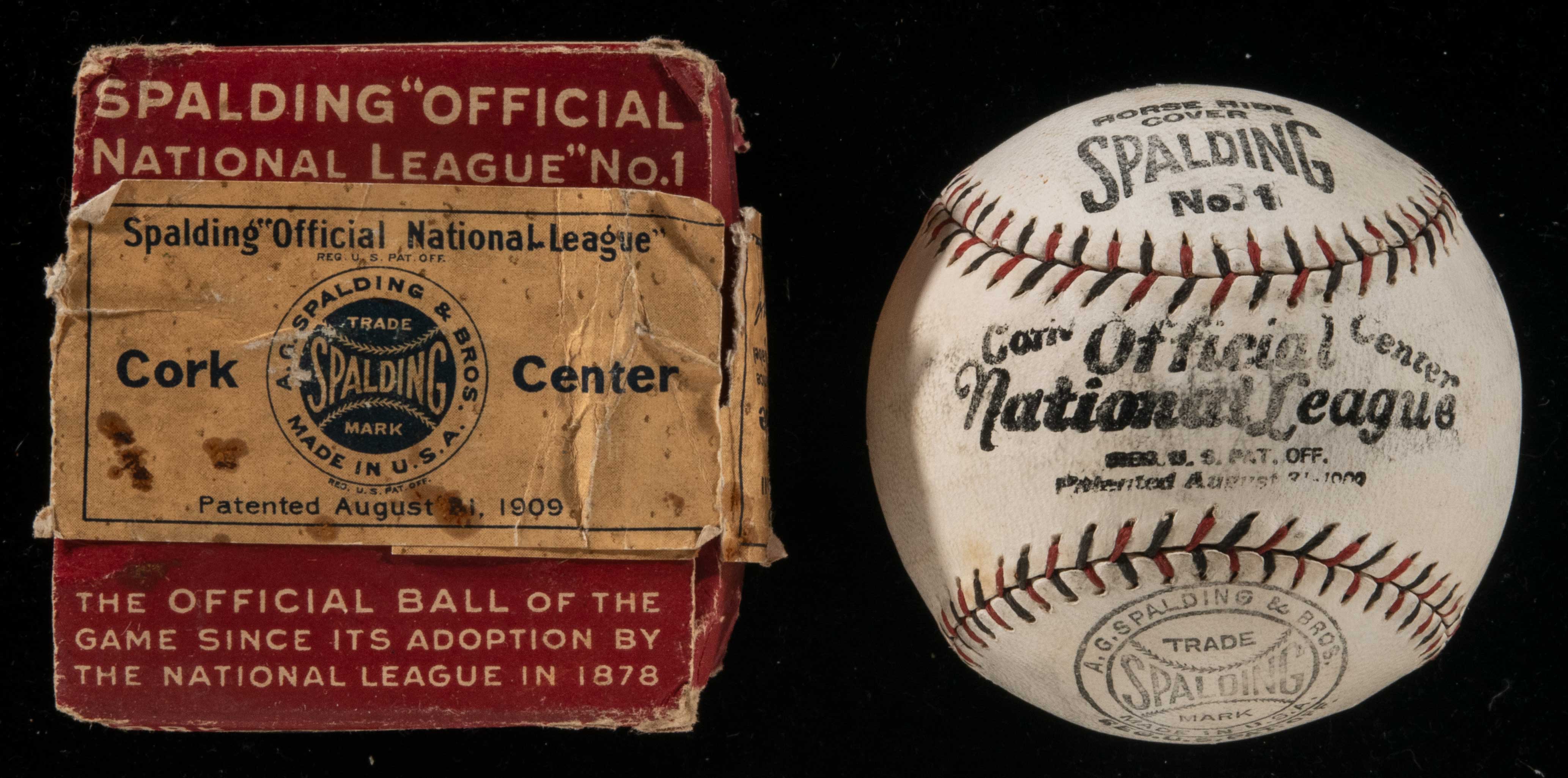 Description:Spalding Official National League baseball with box c.1919-24. Red and black stitched baseball retains bold and well defined Spalding and "Official National League" marks. Outstanding example for display with only light toning and some minimal surface wear. Includes a period box which is missing the lid and has significant flaws throughout: Ball EX-EX/MT, Box PR