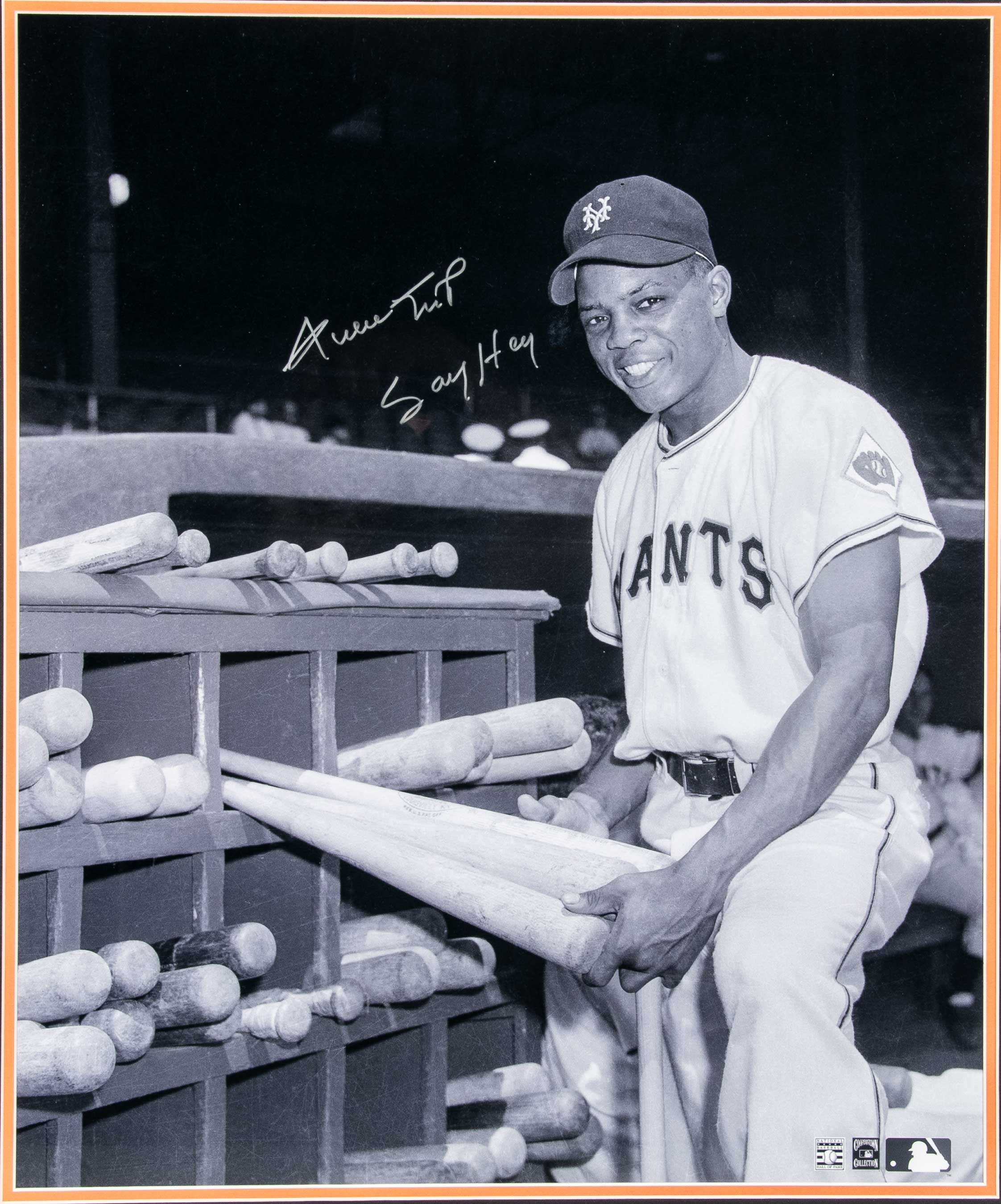 Description:Fine Willie Mays autographed and inscribed "Say Hey" large format photograph. Matted and framed 20"x24' black and white image depicting Mays smiling while selecting a bat wearing New York Giants uniform. Signed in silver paint pen by Mays with very uncommon "Say Hey" inscription. Signature presents beautifully against the black background area rating 9 out of 10. One of only three such examples within the Mays Collection and the first of their type that we have handled. Includes auction LOA from JSA and certificate of provenance from the Willie Mays Collection: NM-MT
