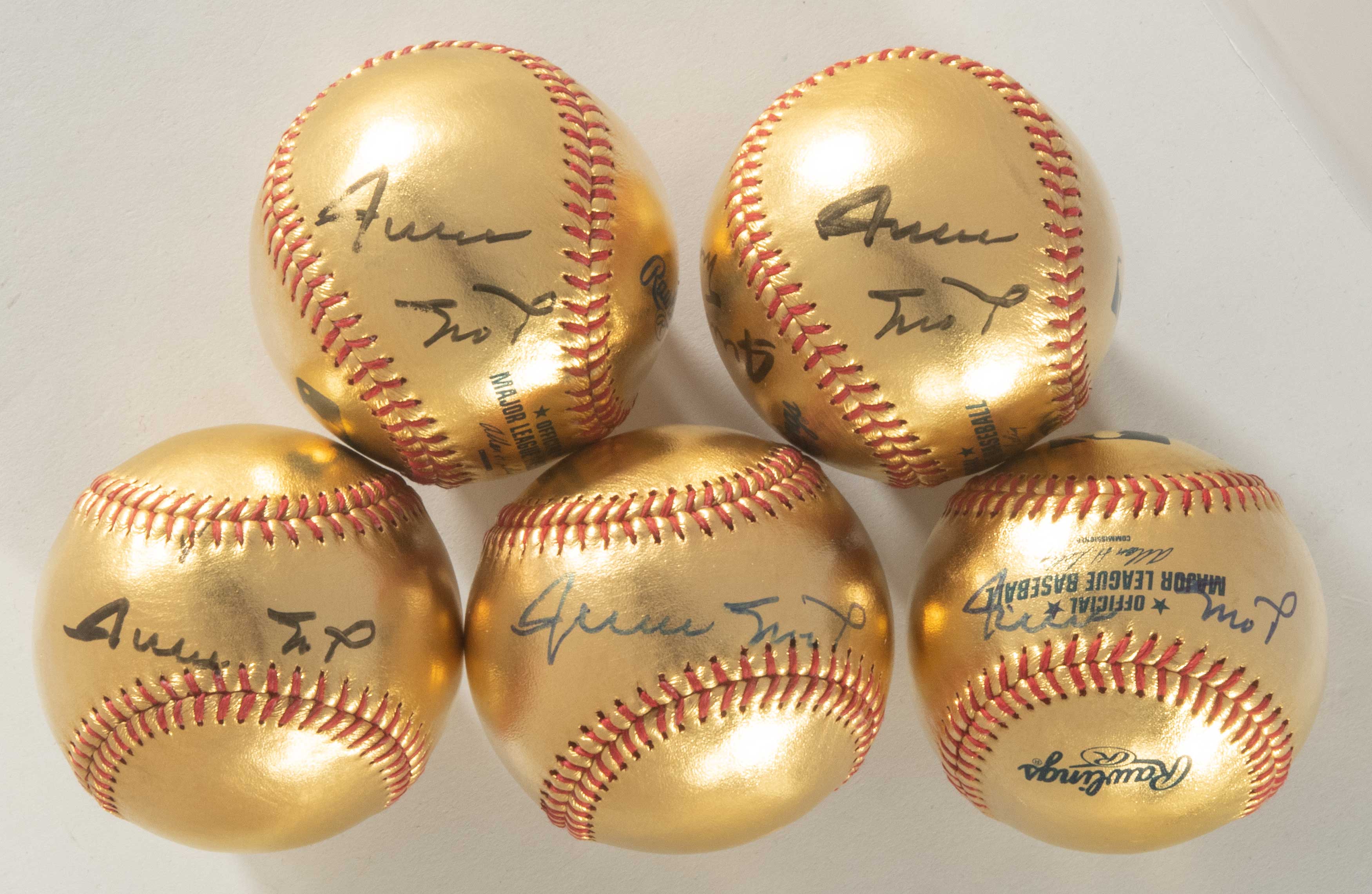 Description:Lot of (5) rare Willie Mays single signed gold baseballs. Group of five limited edition Rawlings gold baseballs which have been signed by Mays in black or blue sharpie across. Signatures are positioned on sweet spots and side panels respectively ranging from 6 to 8 out of 10. One of the baseballs was actually signed twice by Mays along with a third partial signature likely as a test example. Five of only eight such examples that we can document to have been signed by Willie Mays. Includes certificate of provenance from Willie Mays Collection and auction LOA from JSA: Range VG/EX-NM-MT