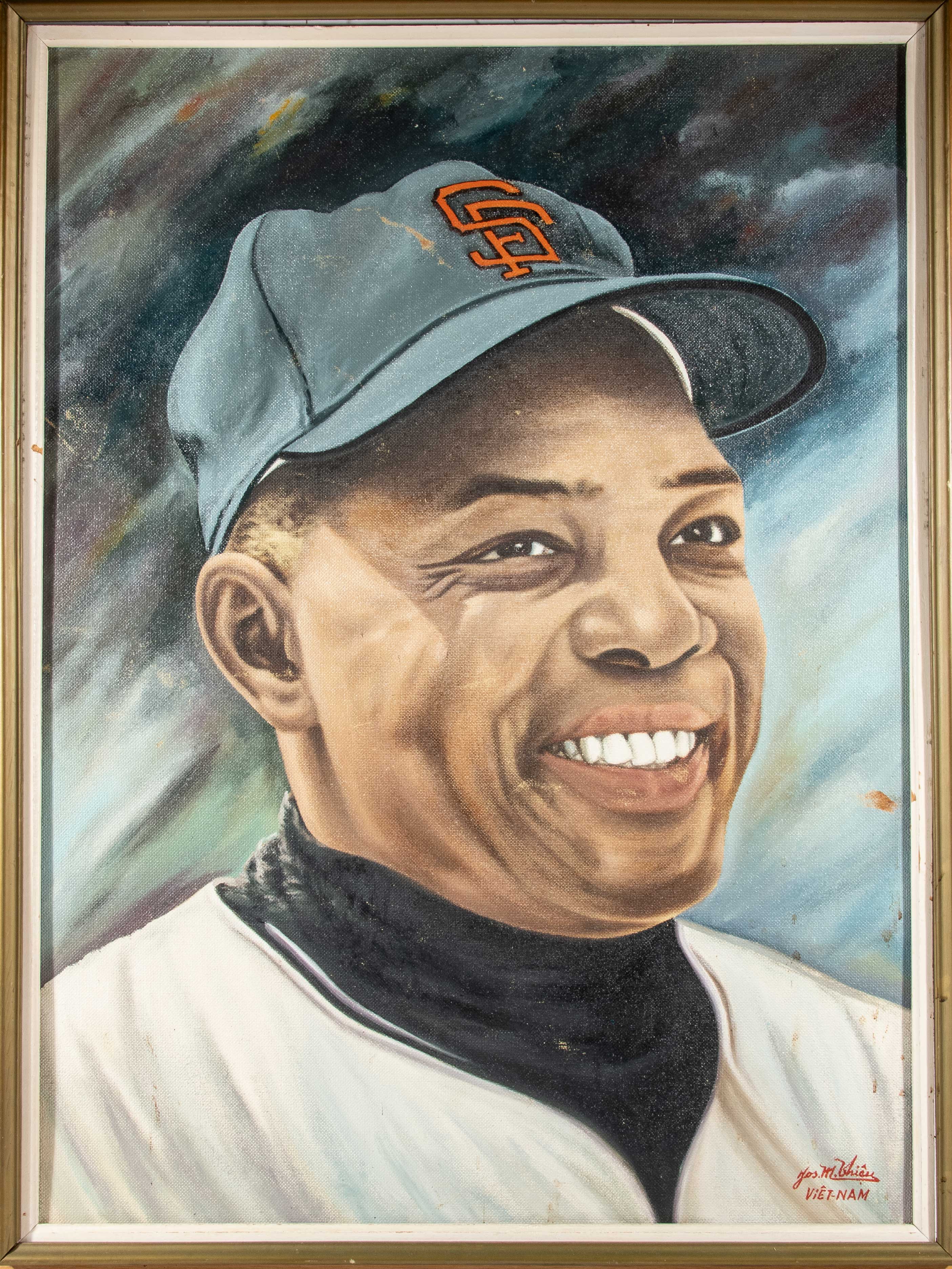 Description:Vintage Willie Mays original large format painting c. 1960-70s.. Enormous original oil on board rendering of Mays smiling in San Francisco Giants uniform. Very well executed painting signed by the artist at bottom right. 29"x39" in its original natural color wooden frame. Includes certificate of provenance from the Willie Mays Collection: EX