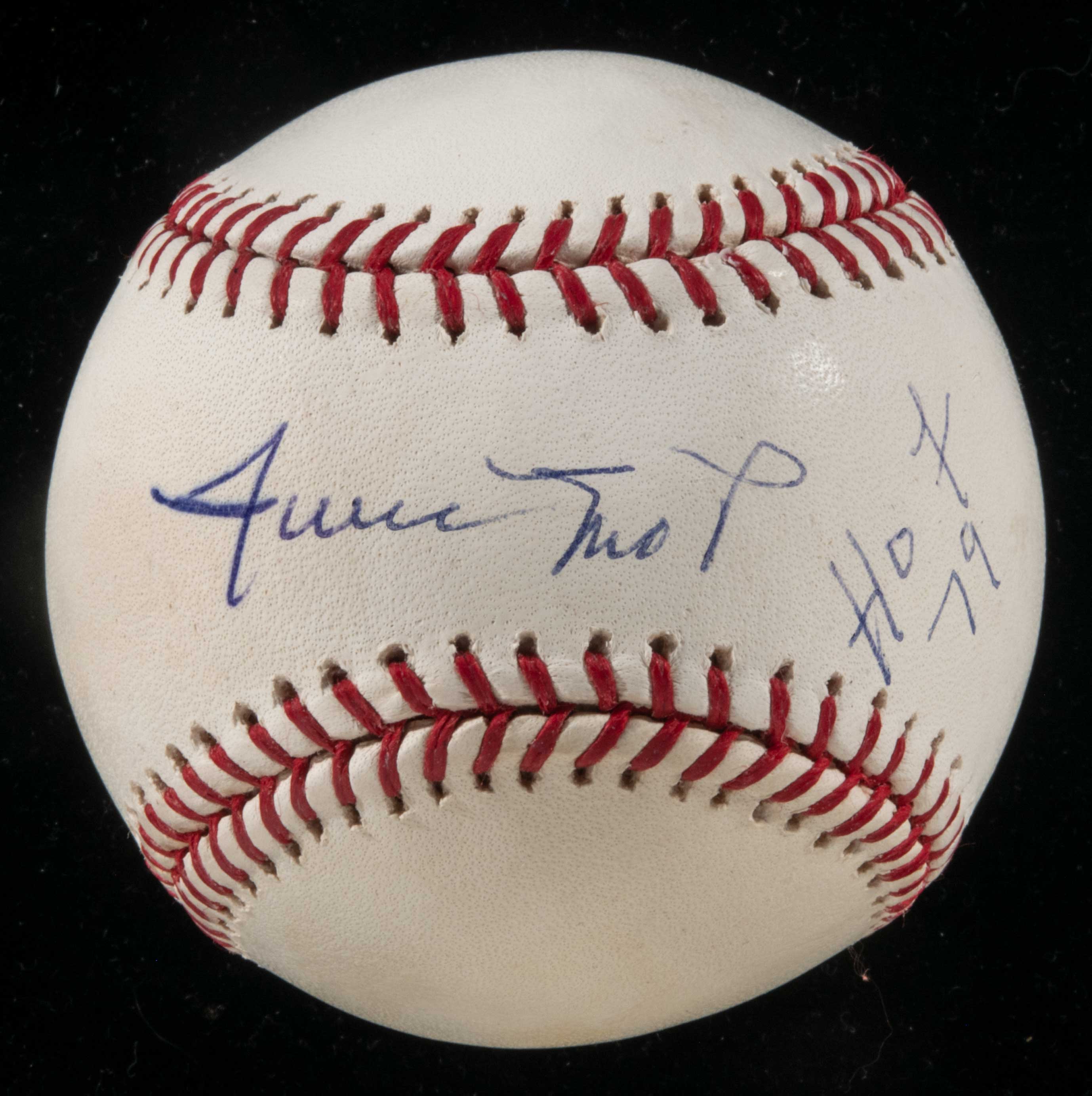 Description:Willie Mays "HOF 79" single signed and inscribed baseball. Rawlings B.Selig Official Major League baseball has been signed "Willie Mays" with a seldom seen "HOF 79" inscription. Ink signature rates 7-7/8 out of 10 and there is some light toning. Includes auction LOA from JSA and certificate of provenance from the Willie Mays Collection: EX/MT