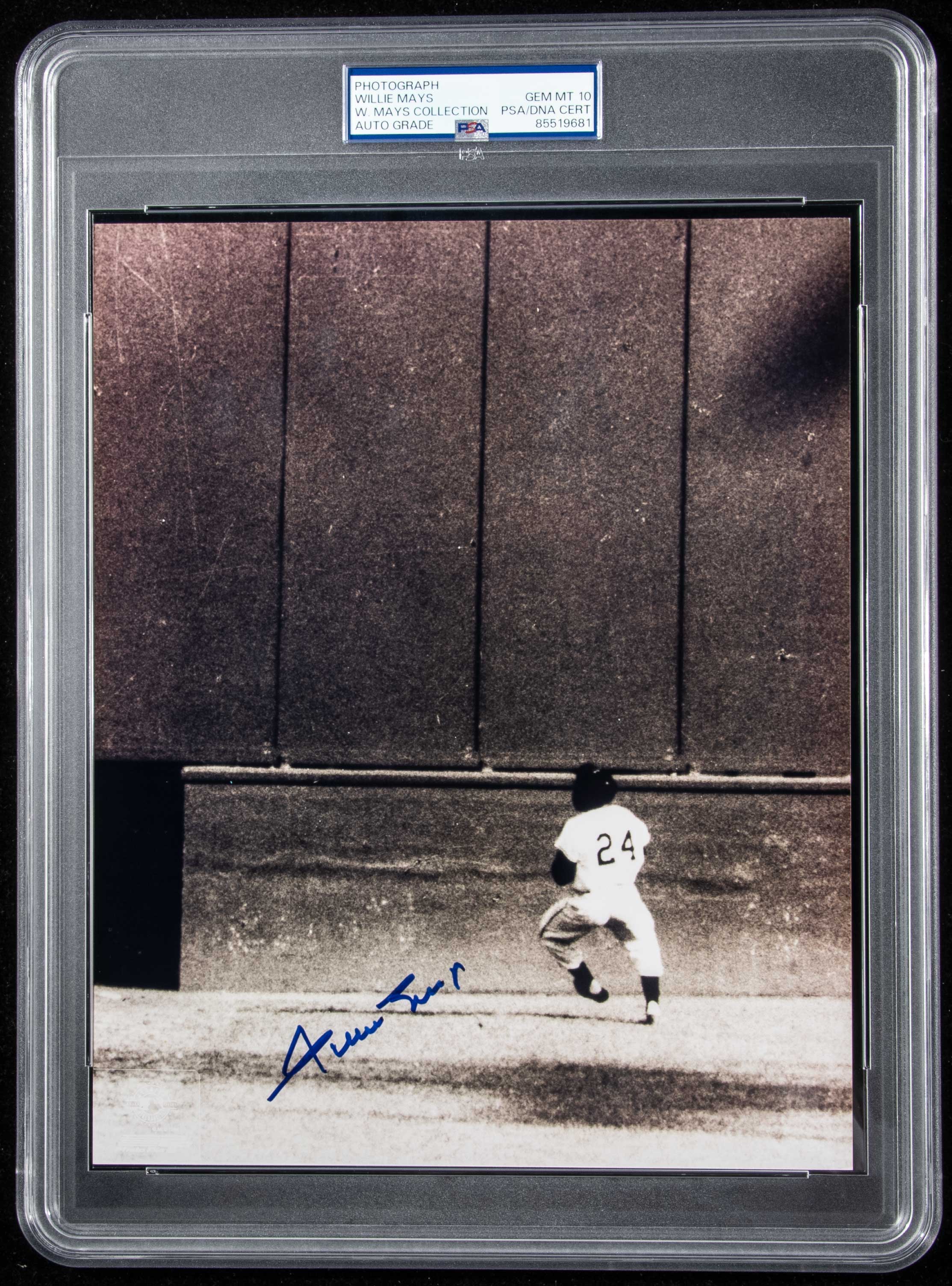 Description: Willie Mays autographed 8"x10" photograph of "The Catch" (PSA/DNA 10 Gem Mint). Black and white photograph has been signed "Willie Mays" in marker with autograph graded PSA/DNA 10 Gem Mint. He is shown during Game (1) of the 1954 World Series making an over the shoulder catch in one of the most famed plays in baseball history. Authenticated and encapsulated by PSA with Mays Collection pedigree noted: PSA/DNA 10 Gem Mint