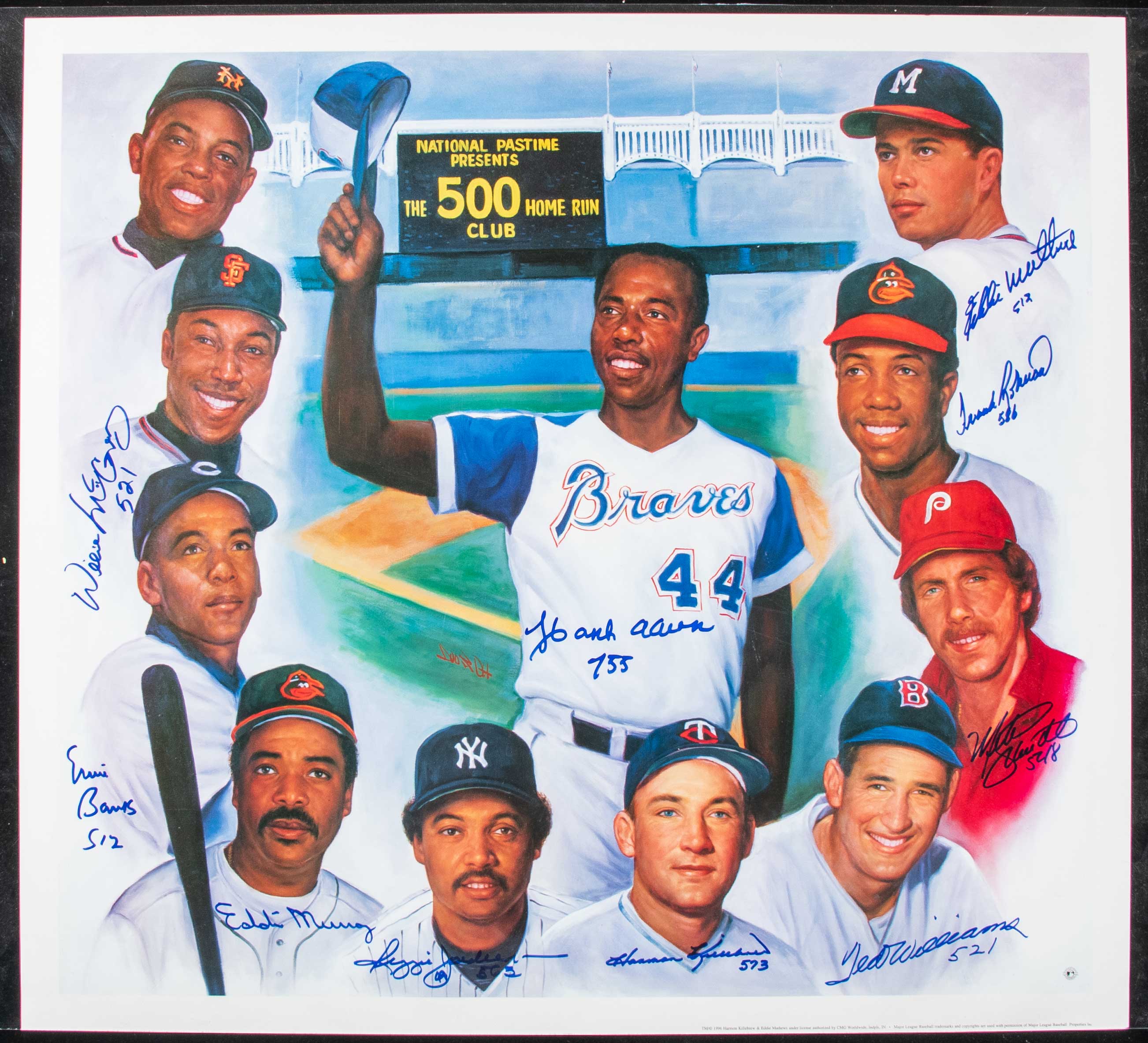 Description:500 Home Run Club autographed poster from the Willie Mays Collection. Large format (27"x29.5") poster showing members of the exclusive 500 Home Run Club has been signed by Hank Aaron, Ted Williams, Willie McCovey, Ernie Banks, Eddie Murray, Reggie Jackson, Harmon Killebrew, Mike Schmidt, Frank Robinson, and Eddie Mathews. All but Murray have inscribed their career home run total. Marker signatures rate 8/9 out of 10 or better. Some minor wear could largely be covered when matted and framed for display. Includes auction LOA from JSA and certificate or provenance from the Willie Mays Collection: Sigs NM, Print VG-EX