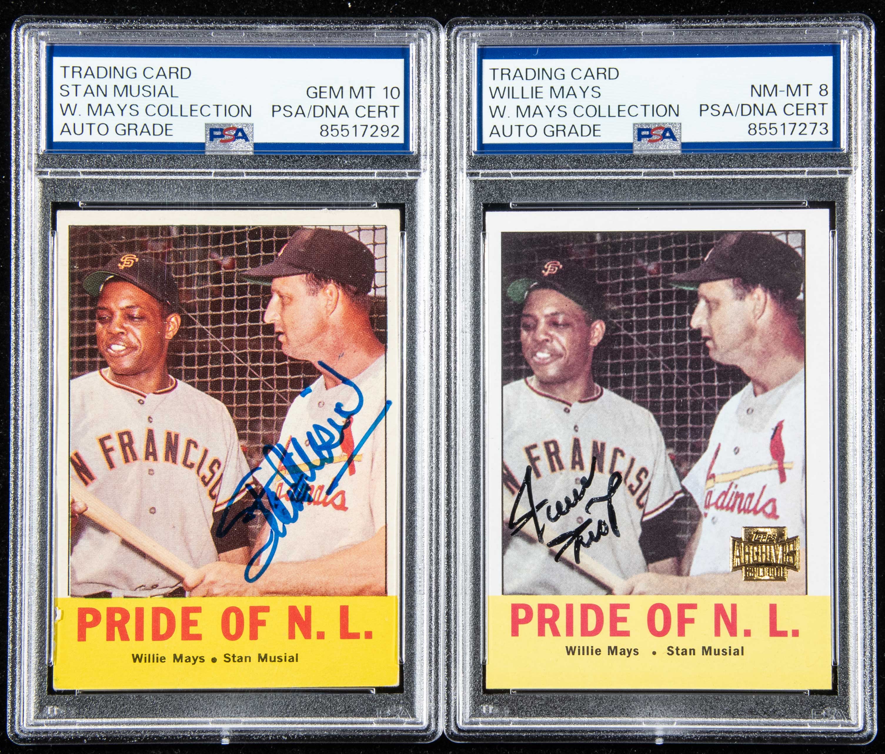 Description:2001 Topps Archives Willie Mays autographed baseball card (PSA/DNA 8 NM-MT) and 1963 Topps "Pride of the NL" card autographed by Stan Musial (PSA/DNA 10 GEM MINT). 2001 Topps Archives card #220 after the classic 1963 Topps card picturing Mays and Stan Musial. Card has been signed across the front in fine tip black marker rating 8 out of 10. Encapsulated by PSA/DNA (8 NM-MT) with special "W.Mays Collection" pedigree labeling. The lot also includes a 1963 Topps Pride of the NL card #128 signed in blue sharpie by Stan Musial. Encapsulated by PSA/DNA (10 GEM MINT) with special "W.Mays Collection" pedigree labeling.