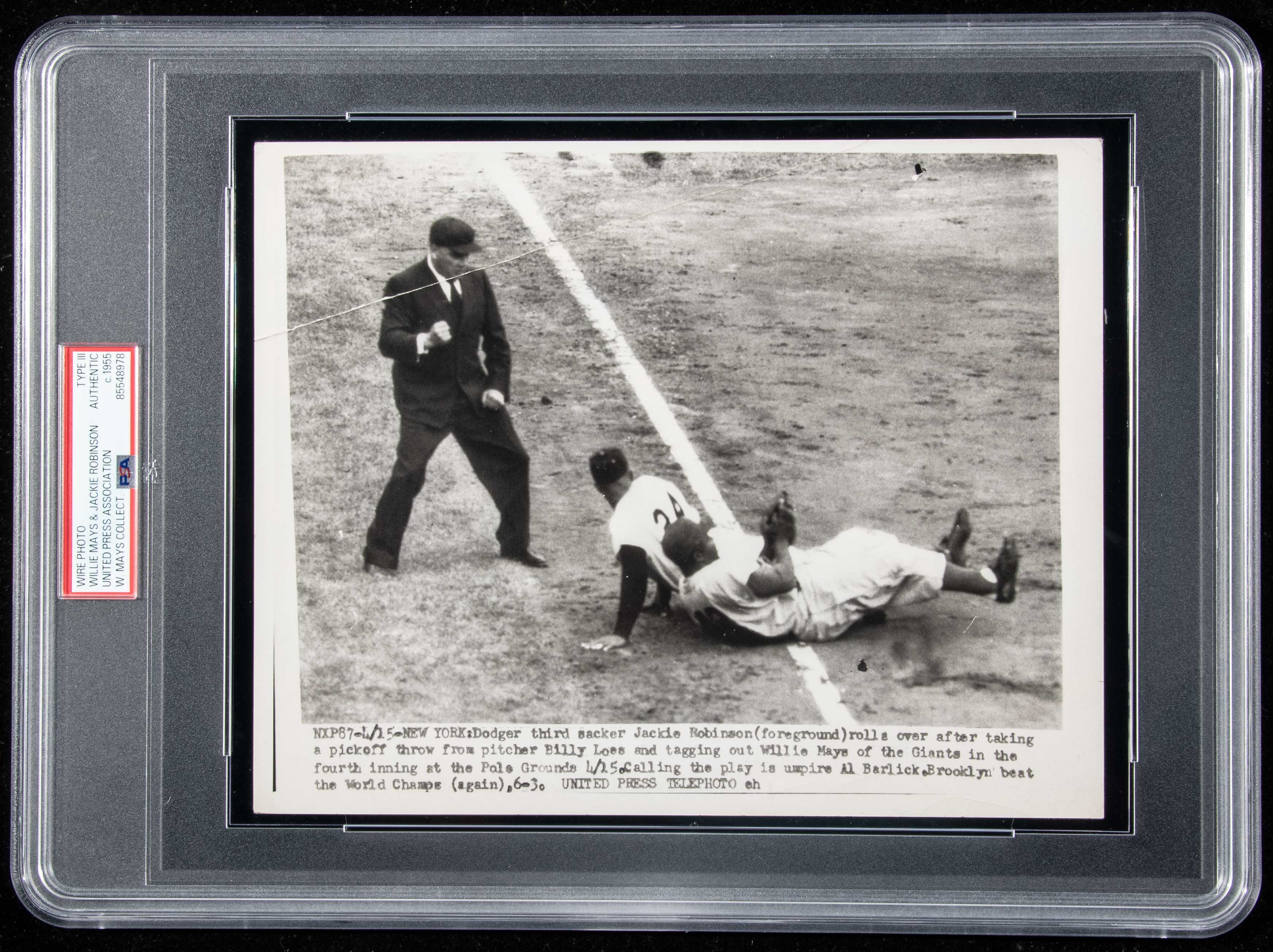 Description:Willie Mays and Jackie Robinson photographc.1955 (PSA/DNA Type III). Uncommon vintage image picturing Willie Mays and Jackie Robinson shown during a pickoff play where Mays was called out on the tag by Robinson. The photo has a large horizontal crease across the top portion with typewritten byline visible at the bottom margin. Stamped by the Associated Press on the reverse. Encapsulated by PSA/DNA (Type III) with special "W.Mays Collection" pedigree labeling: VG