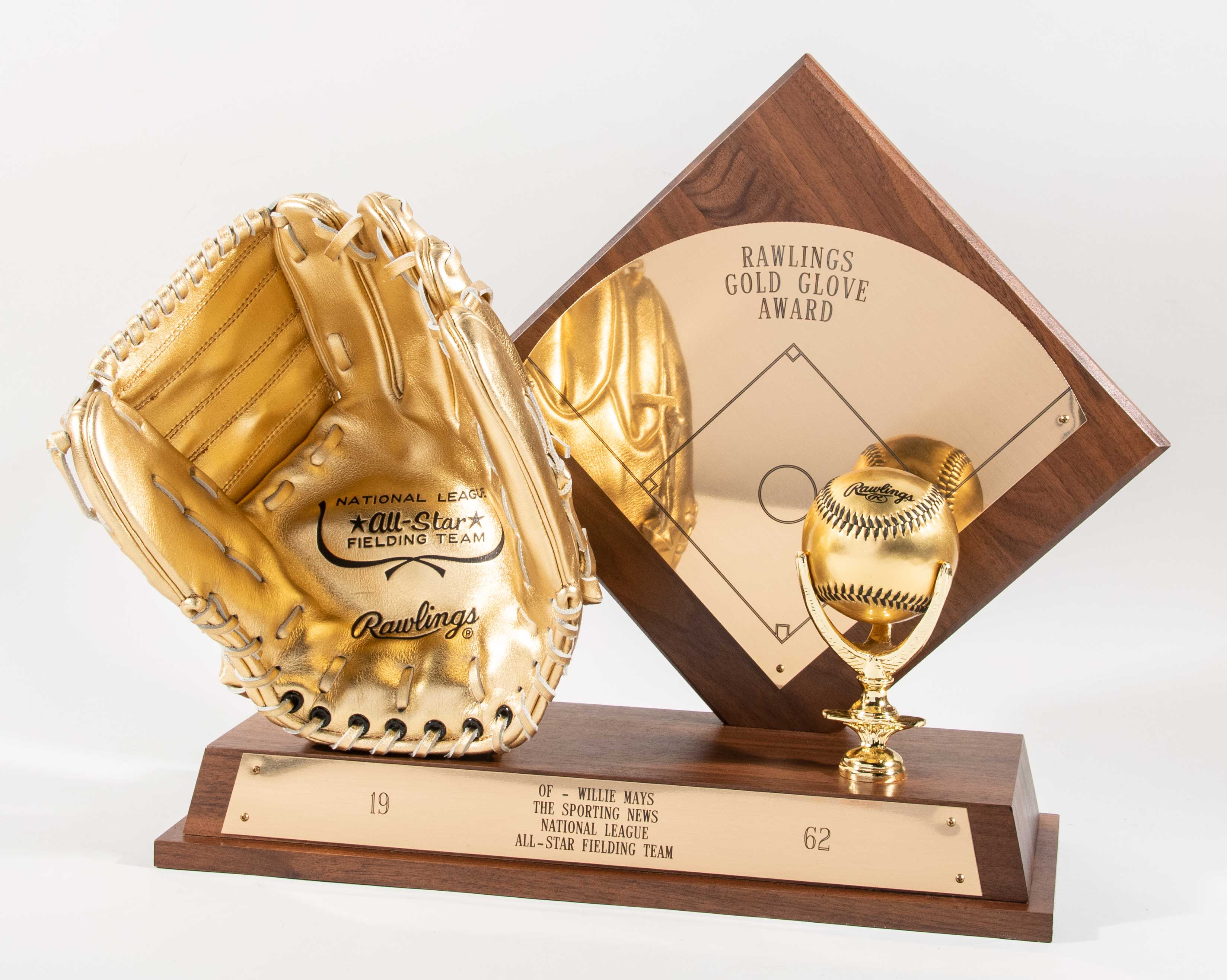 Description:Willie Mays 1962 National League Gold Glove Award (Duplicate Copy). Duplicate rendering ordered by Mays himself of this prestigious figural award as presented annually to the premier defensive players of the National and American Leagues by position. Walnut wooden plinth base displays a full-size gilt-painted Rawlings leather glove with “National League All-Star Fielding Team” impressed black lettering. Gold decorated Rawlings baseball positioned on a brass pedestal affixed in front of diamond shaped wooden backsplash with brass facade having “Rawlings Gold Glove Award” inscribed on front. Brass placard displayed on front of base inscribed, “1962 OF Willie Mays The Sporting News National League All-Star Fielding Team”. 16” long with very minimal surface wear and has been stamped under the base “Duplicate”. Includes certificate of provenance from Willie Mays Collection: EX-MT