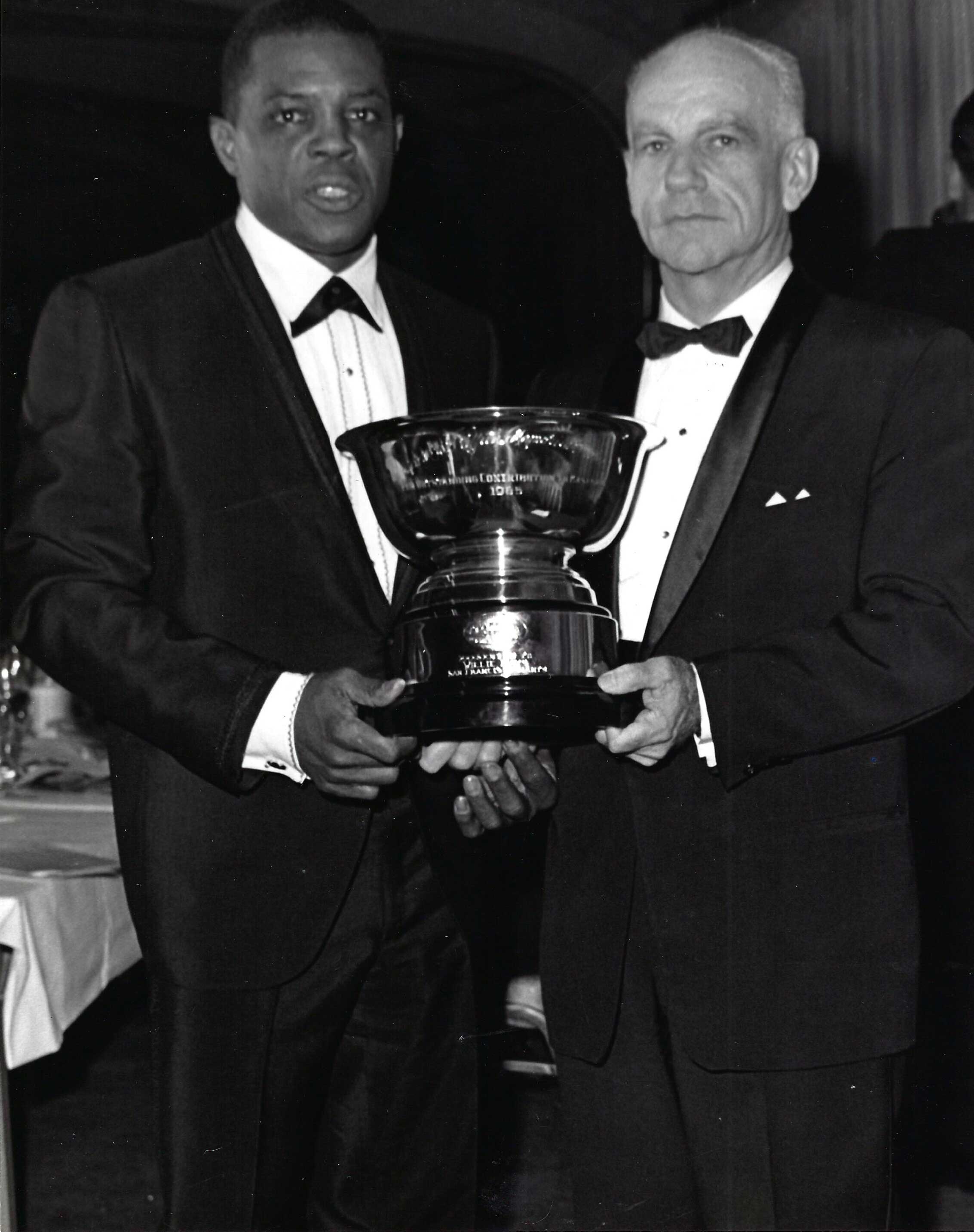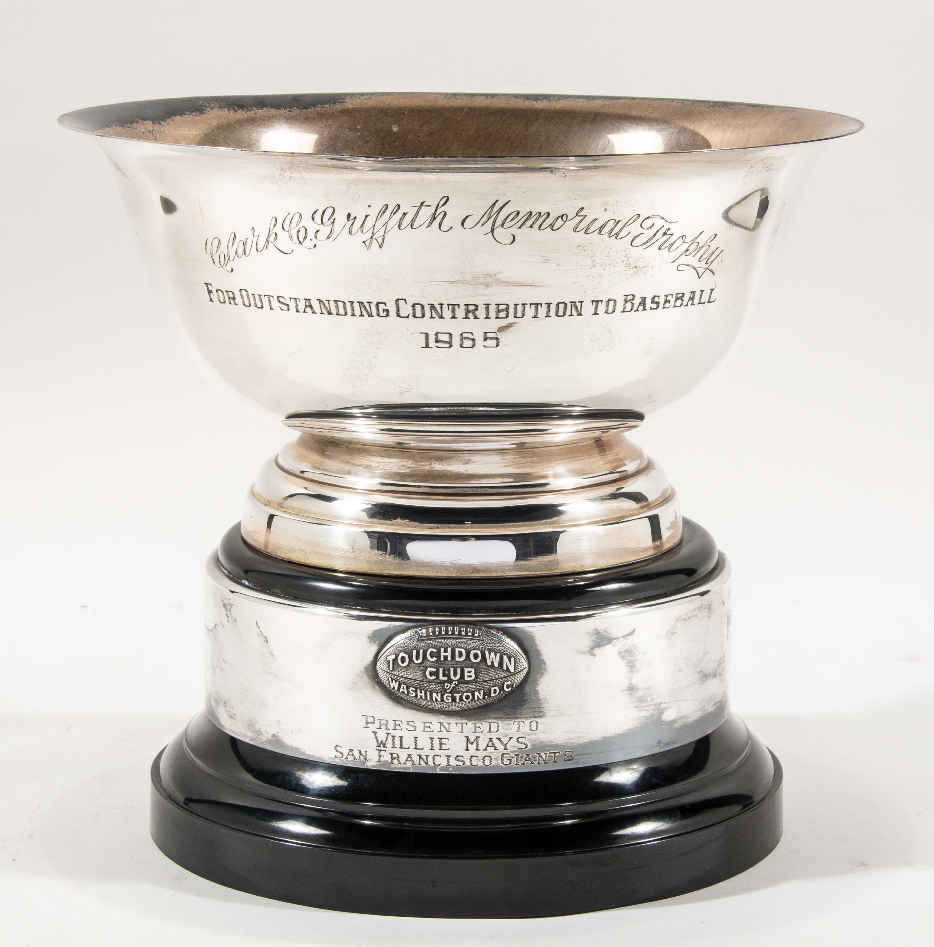 Description:1965 Willie Mays Touchdown Club of Washington D.C. "Clark C. Griffith Memorial Trophy". (NL MVP Season)(Mays Collection Photomatch). Handsome large format award of a prestigious pedigree having been bestowed to Willie Mays by the Touchdown Club of Washington, D.C. Large 12" diameter silverplated bowl is positioned atop of a black Bakelite base with inset silverplated ring decoration. Bowl is engraved "Clark C. Griffith Memorial Trophy For Outstanding Contribution to Baseball 1965". Silver band around the base displays an embossed football shaped insignia for the Touchdown Club with inscription below, "Presented to Willie Mays San Francisco Giants". Overall height is an impressive 11" tall with light general surface wear. Interior of the base reveals its original Balfour metal manufacturer's labeling. The award is accompanied by four original black and white 8"x10" images from the event picturing Mays with other award recipients including the offered award itself. Includes certificate of provenance from the Willie Mays Collection: EX-MT