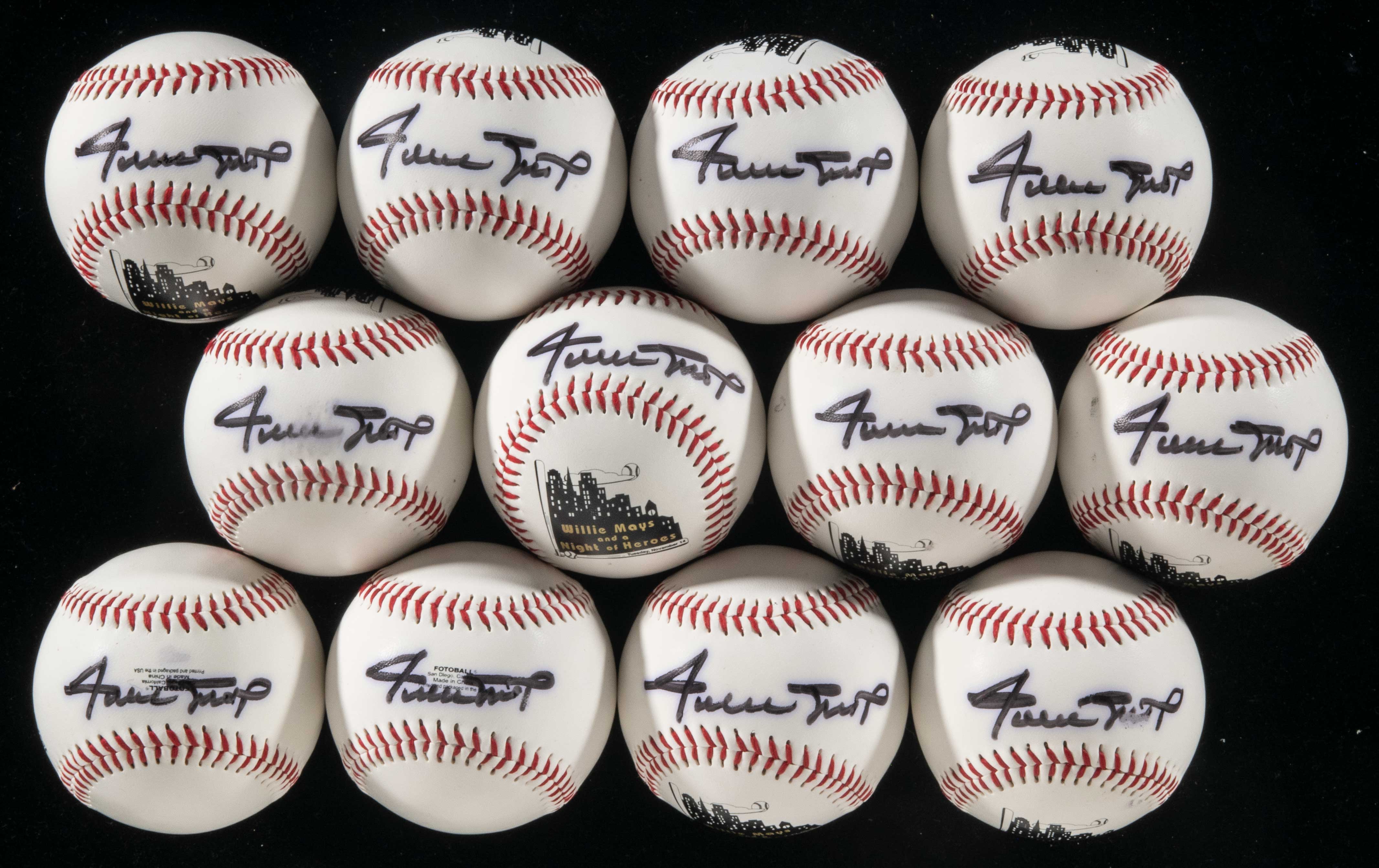 Description:Lot of (12) Willie Mays autographed "Night of Heros" baseballs. Commemorative baseballs featuring a "Willie Mays and Night of Heros" logo are each signed "Willie Mays" across the side panel. Marker signatures average 7-7/8 out of 10 (with very minor bleed - 2 ball grade markedly lesser) and there are a handful of minor condition imperfections effecting a few pieces. Includes auction LOA from JSA and certificate of provenance from the Willie Mays Collection: VG-EX/MT