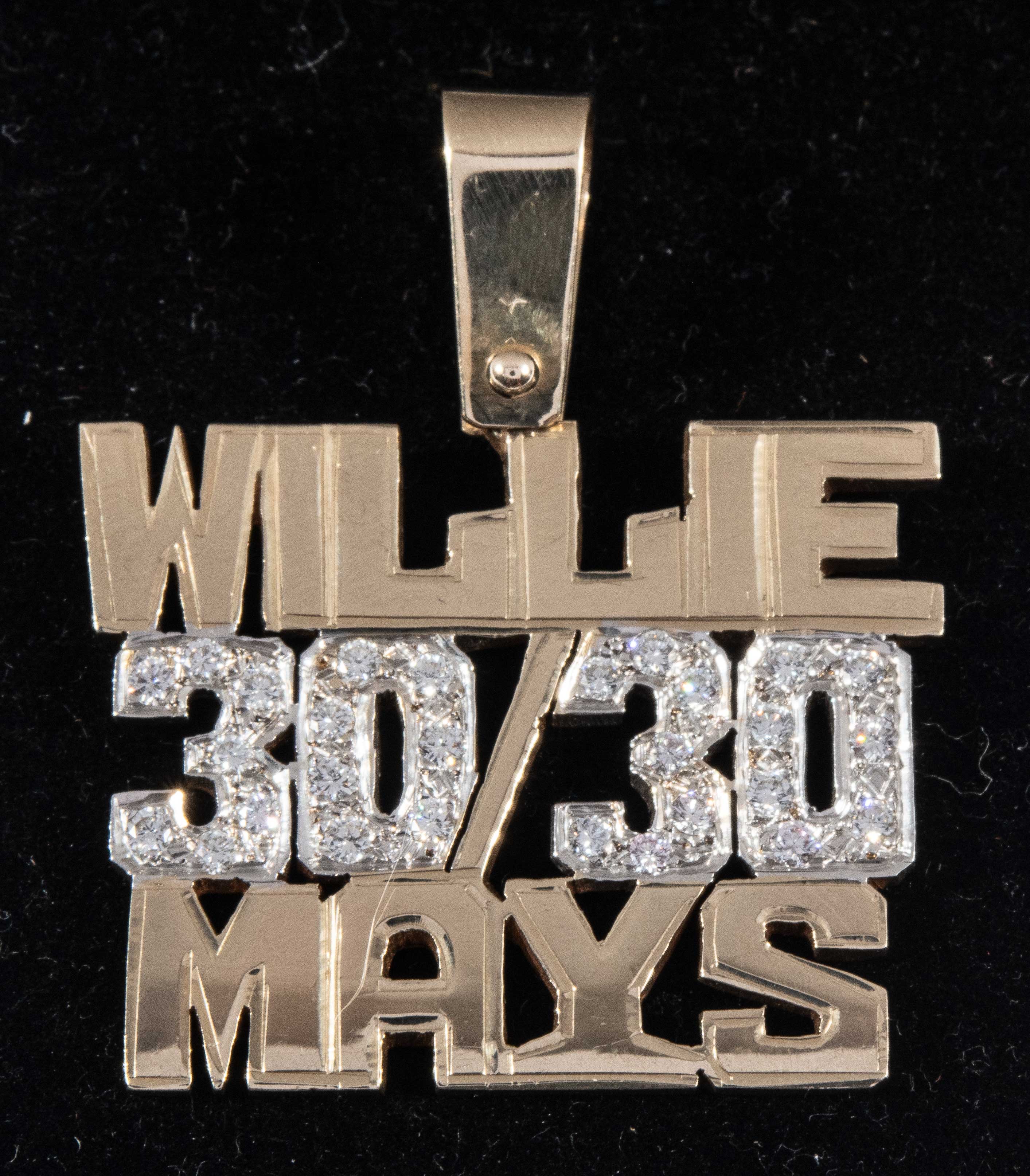 Description:Unique Willie Mays "30/30" gold and diamond pendant. Attractive custom made openwork pendant having "Willie Mays" name above and below "30/30" design related to Mays as a member of the 30 Stolen Base and 30 Home Run Club. Twenty eight inset small diamond stones with an approximate total carat weight of .5 adorn the 30/30 design at center. He first attained the vaunted feat in 1956 and was only the second such player to do so (Ken Williams in 1922). Mays would incredibly repeat the feat again in the very next season of 1957. Stamped "14K"on back, 1 1/4" wide with a total weight of .4 ounces. Includes certificate of provenance from the Willie Mays Collection: NM