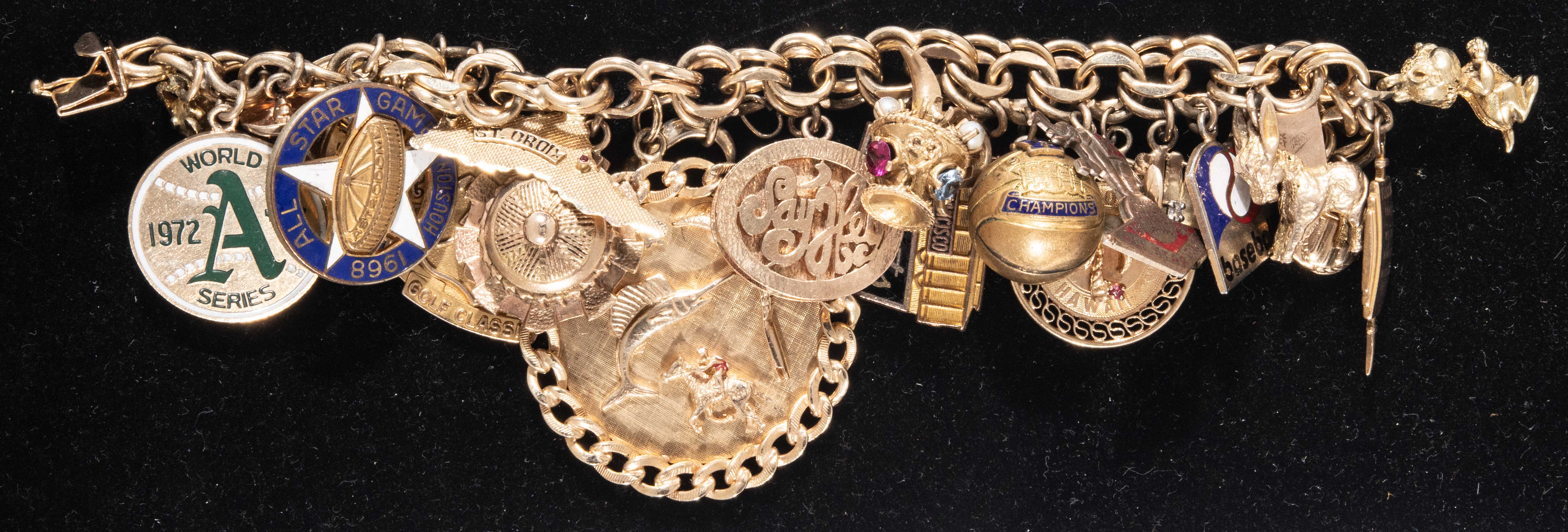 Description:Unique charm bracelet from the Willie Mays Collection. Remarkable 14K gold link chain with a total of (21) individual charms and ornamental jewelry items to include: 1968 MLB All-Star game enamelwork charm; 1972 Oakland A's World Series 10K gold charm, 1966 BBWA Astrodome 14K figural charm; "Say Hey" charm; 1965 Willie Howard Mays Jr. 14K pendant; 1972 Willie Mays American Airlines Golf Classic 14K pendant; 1973 All-Star Game pendant; 1974 Willie Mays Puerto Rico 14K charm; Large Florida 14K pendant; 1972 Hawaii 14K charm; 1955 MLB All-Star Game press charm; 1972 MLB Baseball enamelwork charm; 1971 San Francisco Giants World Series phantom charm, and several other small gold figural charms including baseball glove with small diamond chip. General condition is very fine with a few charms/pendants showing moderate wear and most with light wear. The gold chain itself and majority of the charms and pendants are either 10K or 14K gold with a total overall weight of 6.1ounces. Interesting and comprehensive charm bracelet which spans a wide portion of Mays career and post career time periods. Includes certificate of provenance from the Willie Mays Collection: Range EX-NM/MT