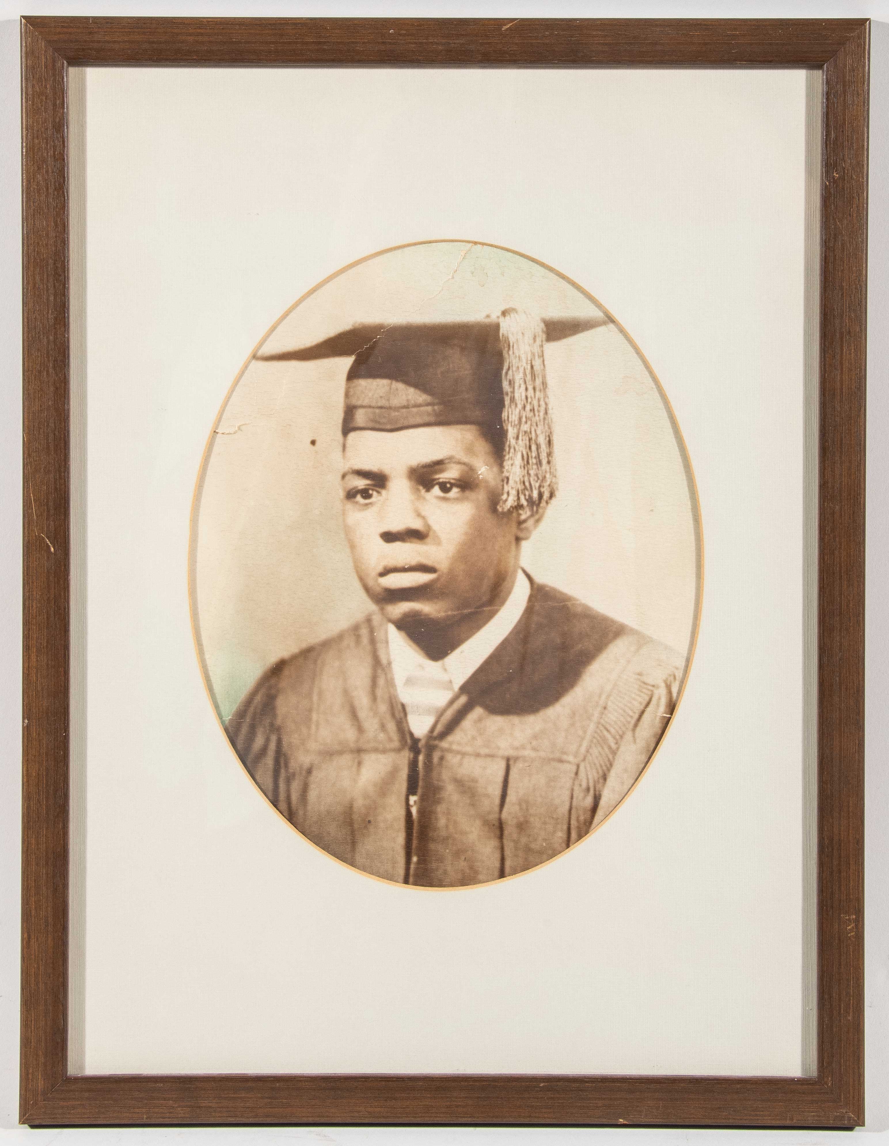 Description:Willie Mays Fairfield Industrial High School graduation photograph c.1950. Matted and framed 9"x12" portrait photograph picturing a young Willie Mays posed in his cap and gown high school graduation ensemble. The image is printed on thick stock photographic board with light hand colored tint. Back of photo has several hand written production notations presumably by the photography studio including eye color, shirt color, and the like along with the Birmingham, Alabama photography studio stamp. Overall appearance is quite pleasing with a pronounced crease at top left in addition to some expected surface crazing and a few other smaller border creases not visible under its oval matting. This very photograph, along with the high school diploma also in this auction, was prominently displayed in Willie Mays' personal office at his home outside San Francisco and was undoubtedly held in special regard as such. Includes certificate of provenance from the Willie Mays Collection: VG