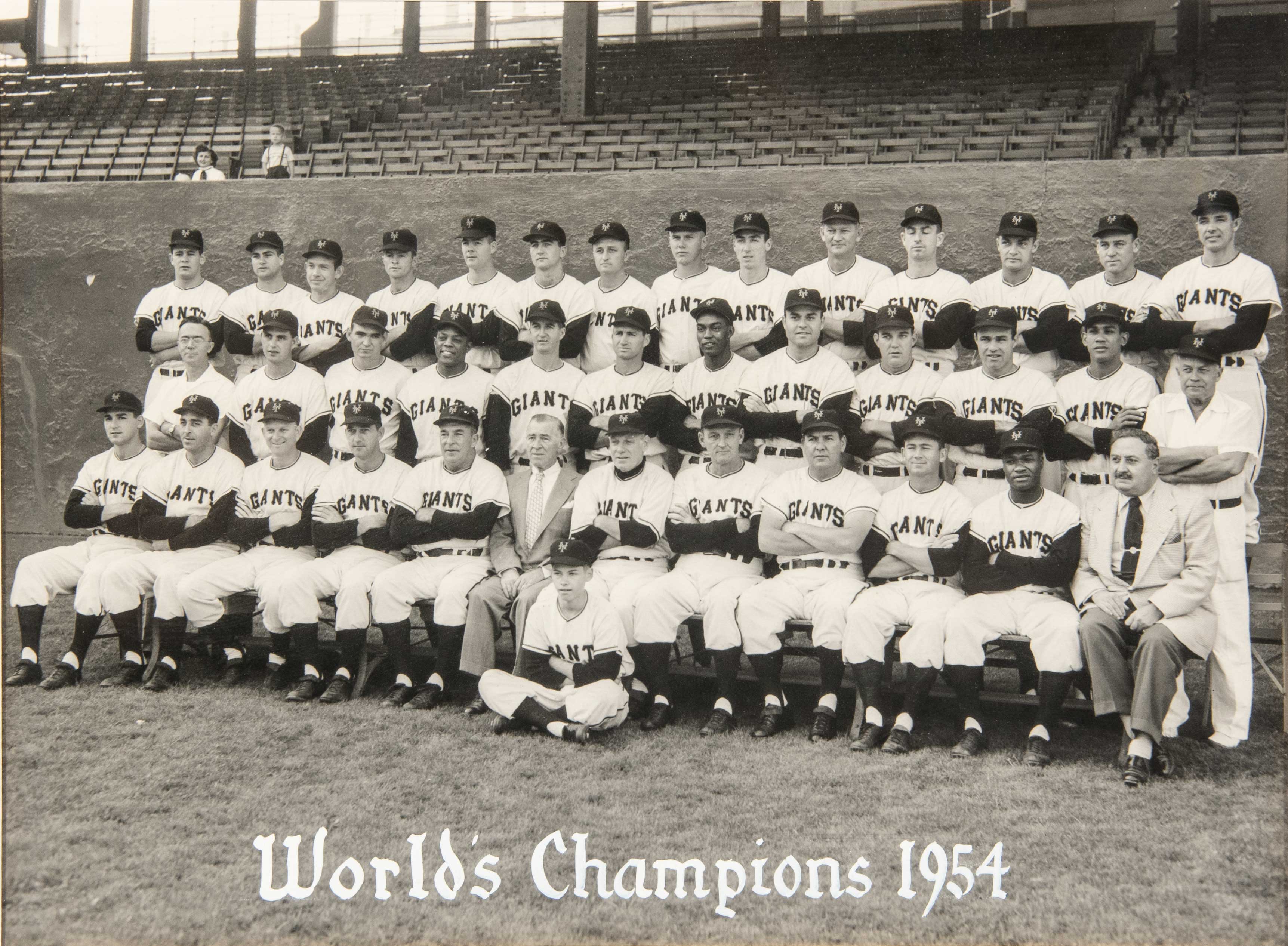 Description:Fine 1954 New York Giants team photograph from the Willie Mays Collection (World Championship Season)(NL MVP Season). Matted and framed 10"x14" matte finish lack and white image of the World Champion New York Giants posed in home uniform at the Polo Grounds in New York. Exceptional clarity registration with Willie Mays smiling in the second row at left. "World's Champions 1954" titling at the bottom in period white cropping ink. Beautiful period image of the Giants' World Championship team as displayed within the home of team leader and 1954 NL MVP award winner. Includes certificate of provenance from the Willie Mays Collection: EX-MT