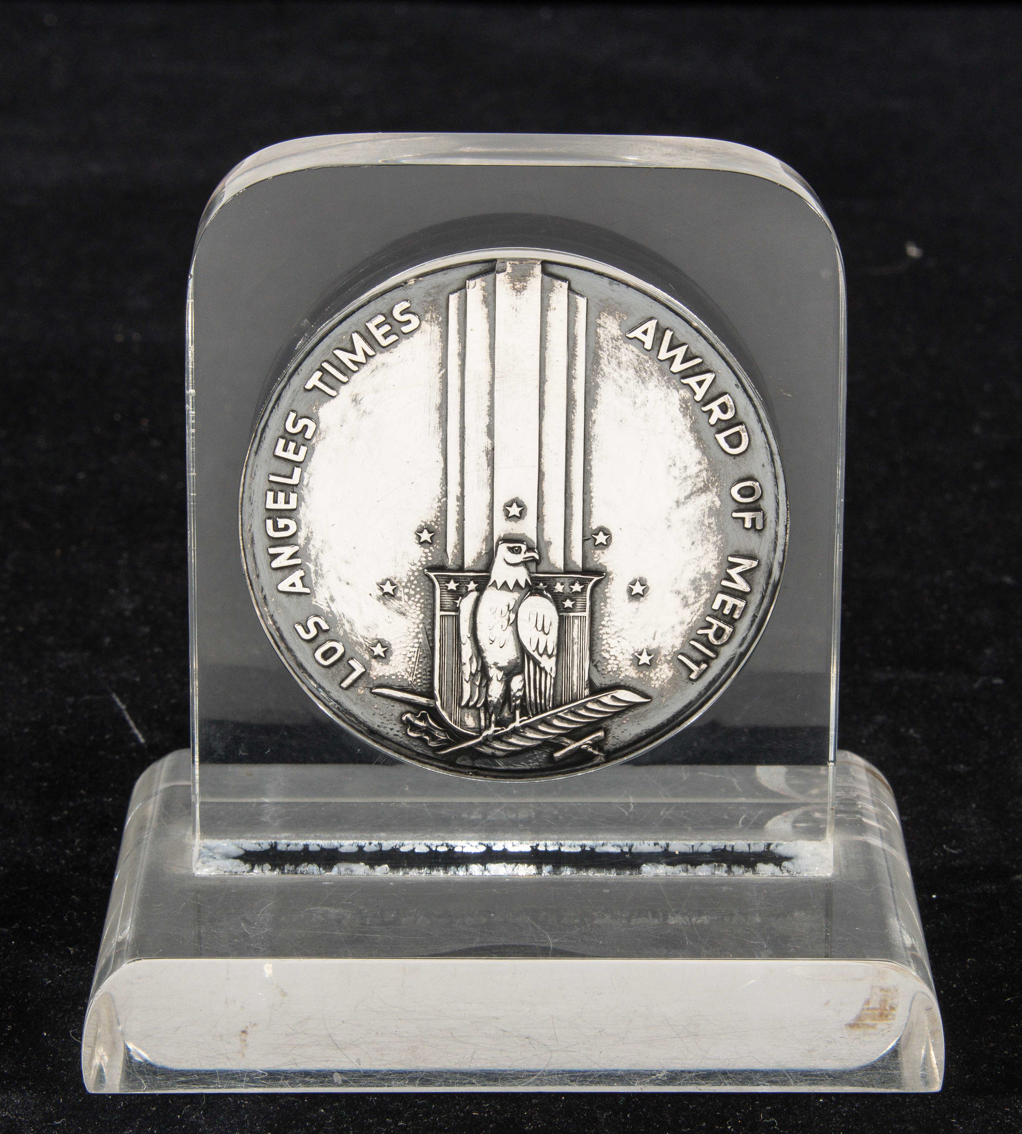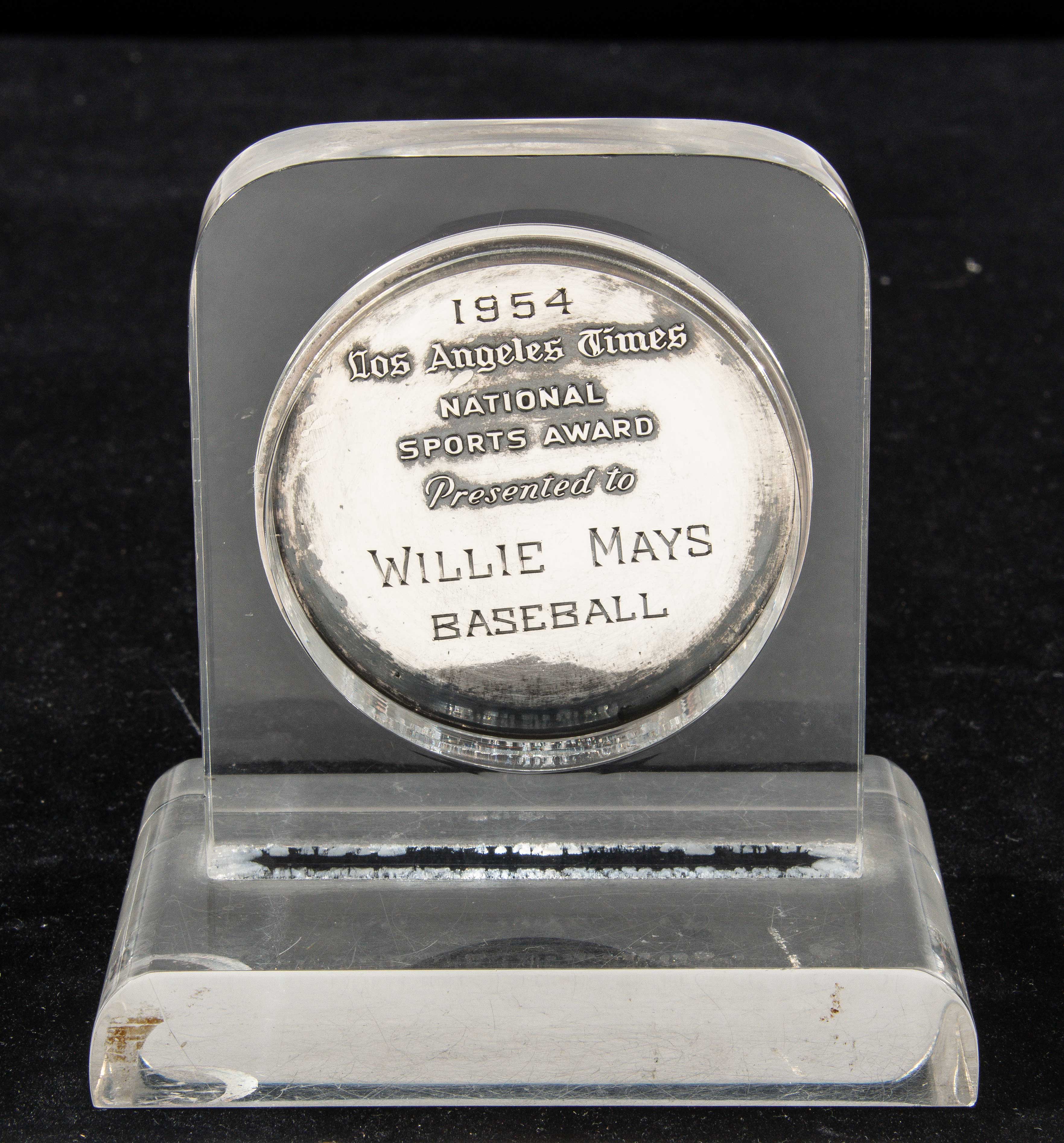 Description:1954 Willie Mays Los Angeles Times Award of Merit (NL MVP Season)(World Championship Season)(Mays Collection Photomatch). Cased silver medal presented to Willie Mays by the Los Angeles Times for the 1954 National Sports Award. The medal measures 3" in diameter and features an American eagle design on the front. The reverse is inscribed, "Los Angeles Times National Sports Award presented to Willie Mays Baseball 1954". Typically presented within a hinged lid leather folio the offered example is affixed within a vintage lucite stand likely done by Mays for display purposes. Includes copy of black and white photograph picturing Mays with the offered award in his trophy display and certificate of provenance from the Willie Mays Collection: EX