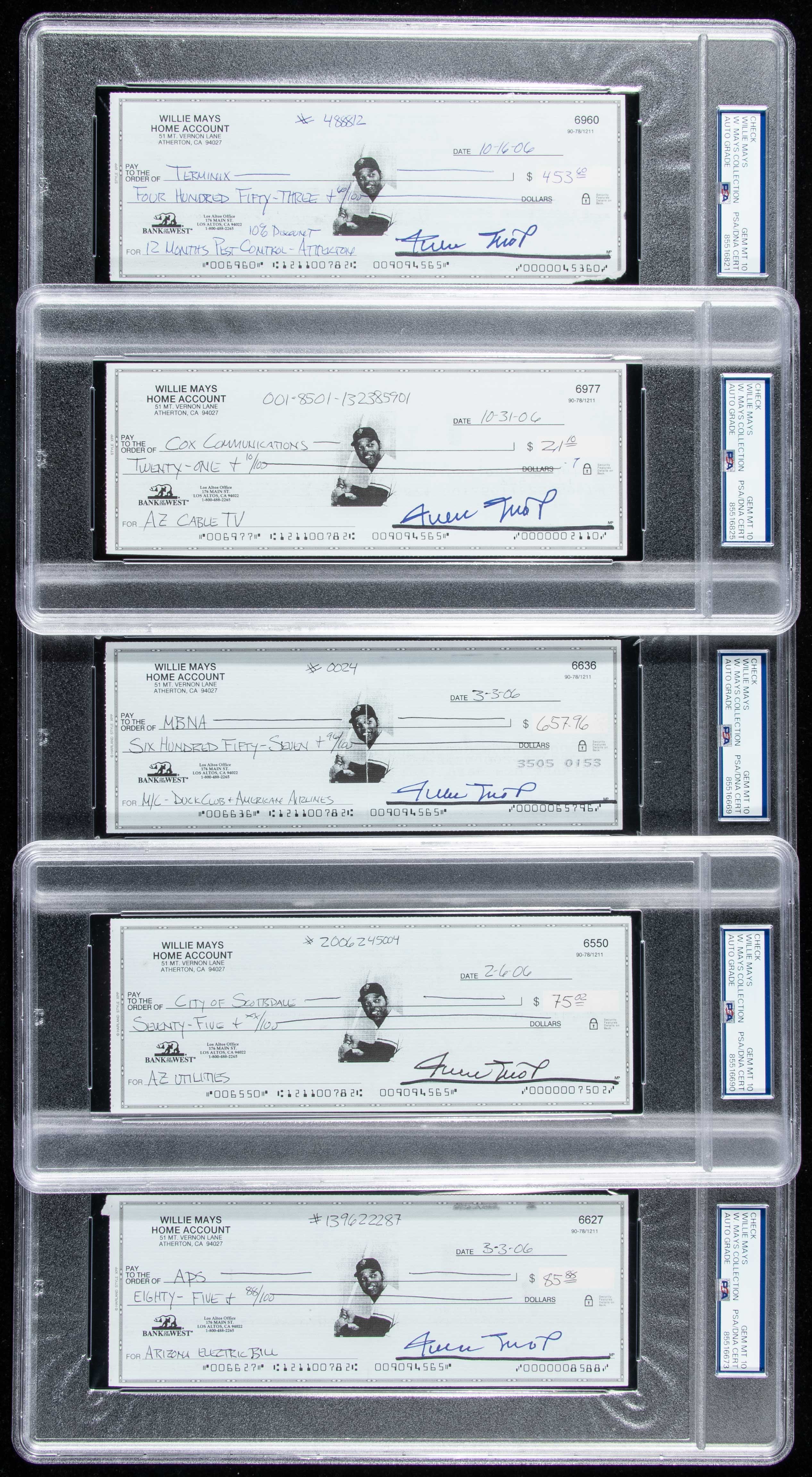 Description:Lot of (5) Willie Mays autographed checks (PSA/DNA 10 Gem Mint). Nice lot of 2006 dated checks, each signed "Willie Mays" at lower right. All autographs are graded "10 Gem Mint" by PSA and there are varying degrees of typical handling and bank cancellation wear (a touch more pronounced in some cases). Each is authenticated and encapsulated by PSA with "W.Mays Collection" noted on the label: Gem Mint