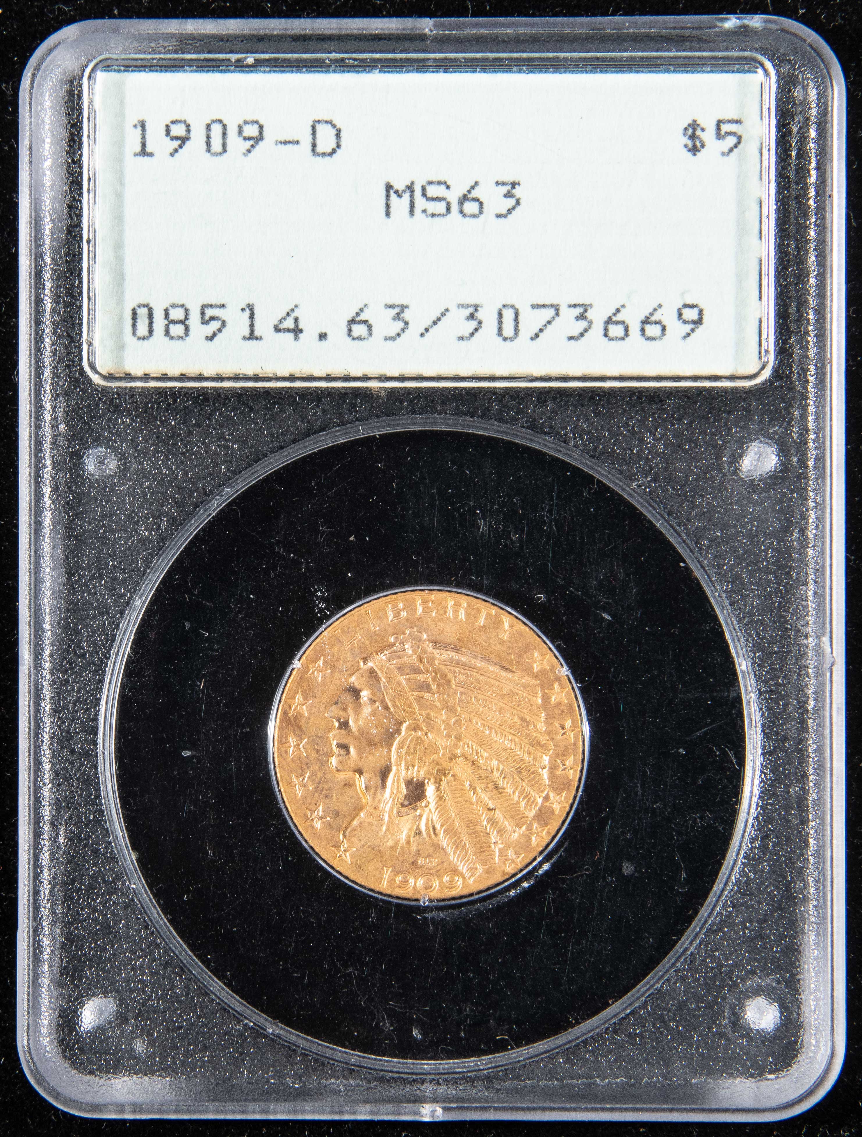 Description:1909-D $5 Gold Indian from the Willie Mays Collection (PCGS MS63 - Gen 1.2 "Rattler"). Desirable gold coin from a widely collected series. Graded MS63 by PCGS and in a Gen 1.2 "Rattler" holder (note - there is wear to the holder however given the desirability and originality of the early PCGS slab we have opted to leave it as is). Includes certificate of provenance from the Willie Mays Collection: PCGS MS63