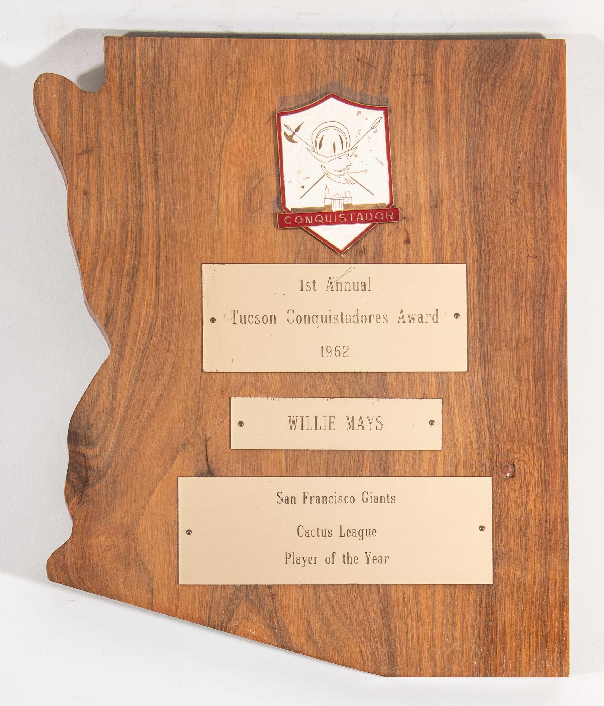 Description:1962 Willie Mays San Francisco Giants Cactus League Player of the Year Award. Walnut wooden plaque given to Mays by the Tucson Conquistadors as its first annual recipient honoring the Player of the Year for the Giants' Spring Training season. Conquistadors enamelwork emblem affixed to the top of the plaque with three inscribed brass plates below including Mays' name, titling, and date. 12" tall with a few moderate surface scratches and top insignia medallion was re-attached slightly askew at some point. Includes certificate of provenance from the Willie Mays Collection: EX