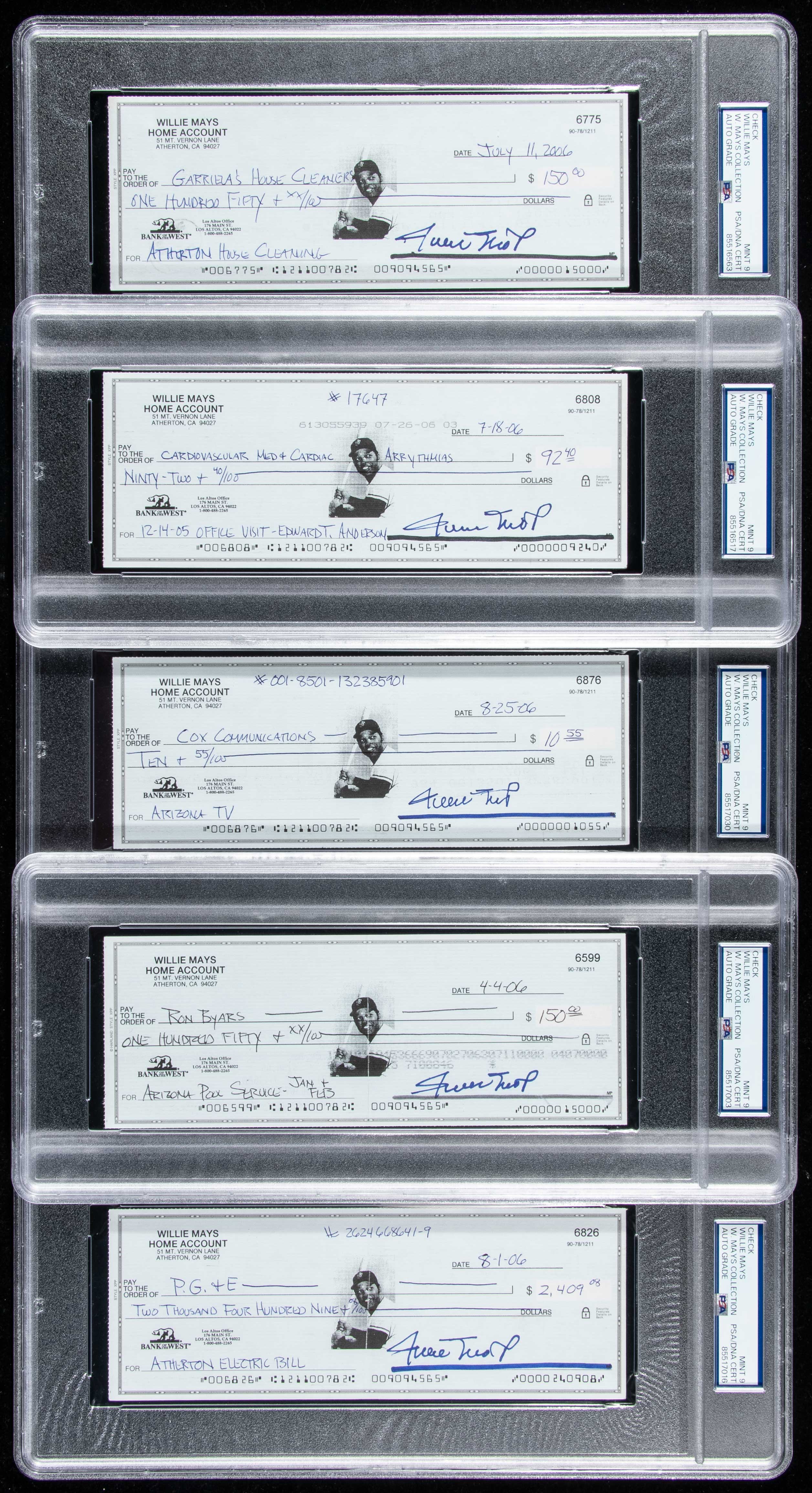Description:Lot of (10) Willie Mays autographed checks (PSA/DNA 9 Mint). Nice lot of 2006 dated checks, each signed "Willie Mays" at lower right. All autographs are graded "9 Mint" by PSA and there are varying degrees of typical handling and bank cancellation wear (a touch more pronounced in some cases). Each is authenticated and encapsulated by PSA with "W.Mays Collection" noted on the label: Mint