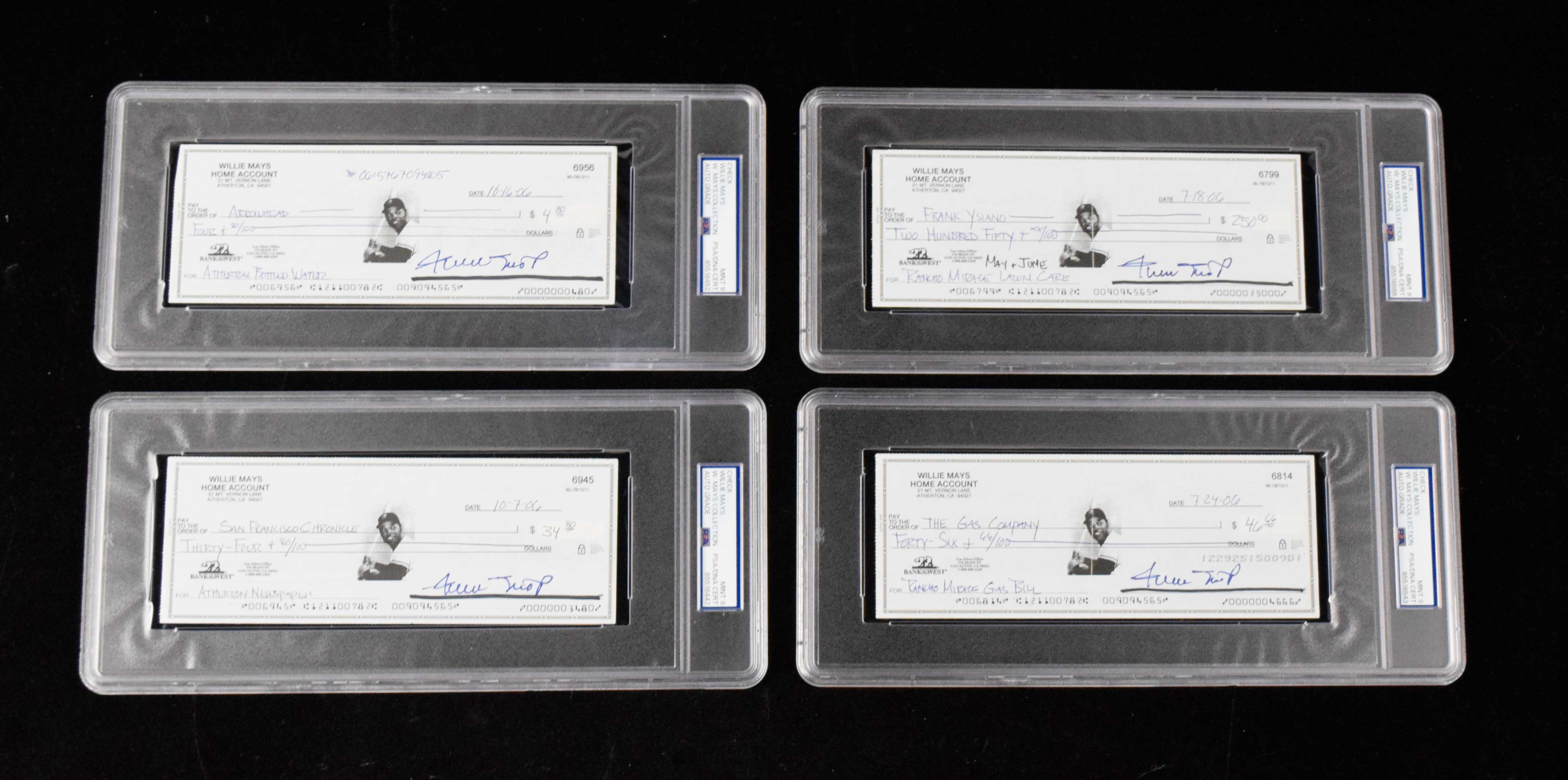 Description:Lot of (12) Willie Mays autographed checks (PSA/DNA 7 NM to 9 Mint). Nice lot of 2006 dated checks, each signed "Willie Mays" at lower right. All autographs are graded by PSA with (4) 9 Mint; (7) 8 NM-MT; and (1) 7 NM. Varying degrees of typical handling and bank cancellation wear (a touch more pronounced in some cases). Each is authenticated and encapsulated by PSA with "W.Mays Collection" noted on the label: NM to Mint